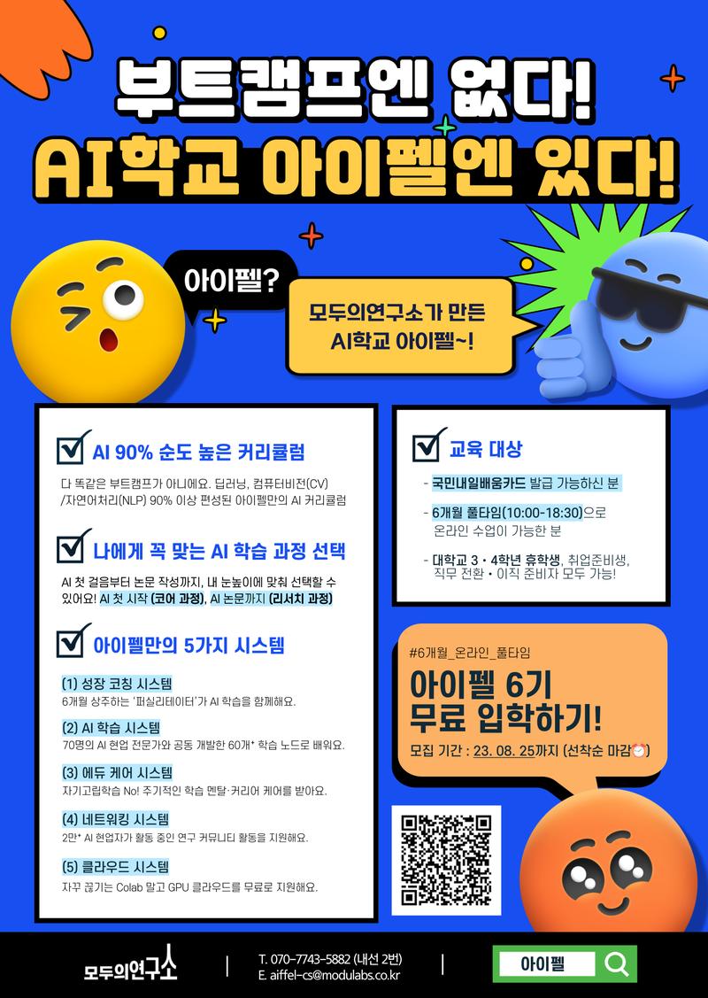 모집기간 : \~ 2023.08.25(금) ※ 정원모집에 따른 상시 면접 및 선발로 조기 마감될 수 있음   문의 : 카카오톡 플러스친구 '아이펠'에서 보다 빠르게 상담하실 수 있습니다. ➡️아이펠 신청 바로가기(클릭)⬅️
