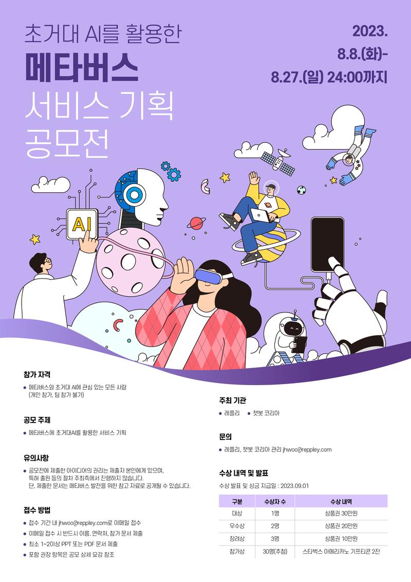 ● 상세 설명 레플리에서 <메타버스+초거대AI 서비스 기획 공모전>에 참가할 분들을 모집합니다. 한국전파진흥협회의 후원을 받아 향후 메타버스의 발전을 위한 참고자료로 활용될 예정입니다. 부담없이 1\~2 페이지 정도로 간단한 아이디어만 제출하시면 됩니다. 아래 세부공고 페이지에서 메타버스와 초거대AI를 접목한 예시를 참고해주시기 바랍니다. 다양한 상품도 드릴 예정이니 많은 참여 부탁드립니다.
