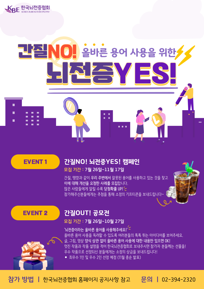 안녕하세요, 한국뇌전증협회입니다. 뇌전증? 간질? 우리 주변에서 어떤 단어를 더 많이 보셨나요? 간질이라는 용어는 '미친 질환'이라는 부정적인 의미를 가지고 있어 2014년 국무회의를 통해 '뇌전증'으로 개정되었습니다. 하지만 아직도 우리 주변은 뇌전증보다 간질이라는 용어를 사용하는 경우가 많습니다. 이에 한국뇌전증협회에서는 개정 전 용어인 '간질'과 뇌전증에 대한 부정적인 의미가 들어간 단어(땡깡, 지랄병 등)를 개선하고, 뇌전증이라는 올바른 용어 사용을 위한 '간질NO! 뇌전증YES!' 캠페인을 진행합니다. 올바른 용어 사용의 중요성을 작품으로 표현하는 '간질OUT! 공모전'을 진행하오니 하단 공지 확인하시어 많은 관심과 참여 부탁드립니다. **** 모집기간 : 7월 26일(수) \~ 10월 27일(금) 활동내용 : 올바른 용어 사용에 대한 주제가 담긴 작품 공모(양식 제한 없음) 활동혜택 : 참가자 선물 제공 및 최우수, 우수 작품 시상 제출서류: 공모전 신청서(한국뇌전증협회 홈페이지 공지사항 내 첨부파일 확인), 작품 파일 작품접수 : 한국뇌전증협회 이메일 접수 ( epilepsy-kr@daum.net ) * 최우수 1인 및 우수 2인 선정 예정 (11월 중순 발표) * 상금에 대한 세액 자부담 **** * 문의 : 한국뇌전증협회 사무처 ( 02-394-2320 ) * 접수된 사례 및 작품은 추후 한국뇌전증협회 SNS에 업로드 될 수 있습니다. * 공모전 외에도 인식개선 사례를 공유하는 '간질NO! 뇌전증YES! 캠페인'도 진행하고 있으니 많은 참여 부탁드립니다.