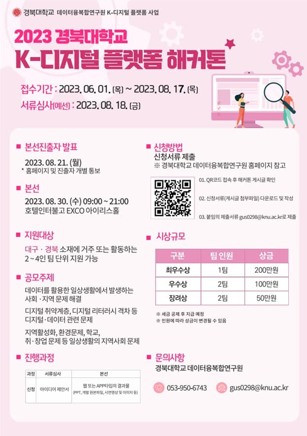 ○ 일정 - 신청기간 : 2023. 6. 1.(목) \~ 2023. 8. 17.(목)까지 - 예선심사 : 2023. 8. 18.(금) - 본선진출자 발표 : 2023. 8. 21.(월) - 본선 : 2023. 8. 30.(수) 9:00 \~ 21:00, 호텔 인터불고 EXCO 아이리스홀 ○ 참여대상 - 해커톤에 관심있는 누구나, 2 \~ 4인 구성 팀 * 1인팀 지원불가 ○ 공모주제 - 데이터를 활용한 일상생활에서 발생하는 사회, 지역 문제 해결 - 디지털 취약계층, 디지털 리터러시 격차 등 디지털 데이터 관련 문제 - 지역활성화, 환경문제, 학교, 취창업 문제 등 일상생활의 지역사회 문제 ○ 시상내역 - 총 상금 500만원, 5팀 선정 ㅁ 최우수상 200만원(1팀) ㅁ 우수상 100만원(2팀) ㅁ 장려상 50만원(2팀) * 세금 공제 후 지급 예정 ○ 신청방법 - 6. 1.(목) \~ 8. 17.(목)까지 제출서류(첨부파일 참고) 작성 후 gus0298@knu.ac.kr 이메일 제출 * 제출서류 링크 : 경북대학교 데이터융복합연구원 홈페이지
