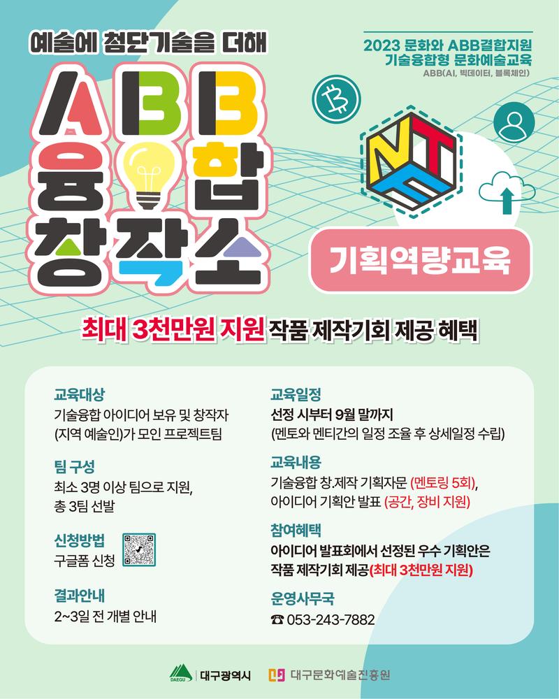 🚀 ABB 융합 창작소 기획역량교육이 당신을 찾아갑니다! 🚀 ✨ 당신은 기술과 아이디어의 융합을 꿈꾸는 창작자인가요? 지역 예술인 중에서도 독특한 아이디어로 무대를 빛내고 싶은 분들을 위해 최대 3천만원의 지원을 동반한 특별한 기회가 왔습니다! 🔍 교육 대상: 기술융합 아이디어를 보유한 창작자들로 구성된 프로젝트 팀! 최소 3명 이상의 팀으로 지원 가능하며, 총 3팀만을 선발합니다. 📆 교육 일정: 선정된 팀은 9월 말까지 멘토와 함께 프로그램을 진행하며, 상세 일정은 멘토와 멘티간의 조율을 통해 수립됩니다. 📚 교육 내용: 기획자문을 통한 기술융합 창, 멘토링 5회 및 아이디어 기획안 발표! 공간과 장비 지원까지! 📝 신청 방법: 구글폼을 통해 신청하세요. 💰 참여 혜택: 아이디어 발표회에서 선정된 우수 기획안은 최대 3천만원의 지원을 통해 당신의 작품을 현실로 만들 수 있습니다! 📢 결과는 2\~3일 전에 안내됩니다. 📞 문의: 운영사무국 053-243-7882