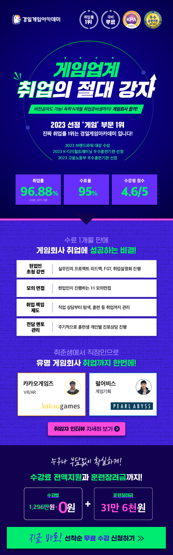 ○ 혜택내역 - 수강료 전액 정부지원으로 일체 자기부담금이 없습니다. - PC\, 교재 등 모두 준비되어 있습니다. 몸만 오시면 됩니다. - 수업만 들어도 월 316\,000원 장려금을 받을 수 있습니다. - 국.취.제 신청시 최대500\,000원씩 6개월간 추가로 더 지원받을 수 있습니다. - 수료후에도 취업에 필요한 공고매칭\,이력서\,자소서\,포트폴리오 등의 모든 구직활동을 무료로 지원해드립니다.