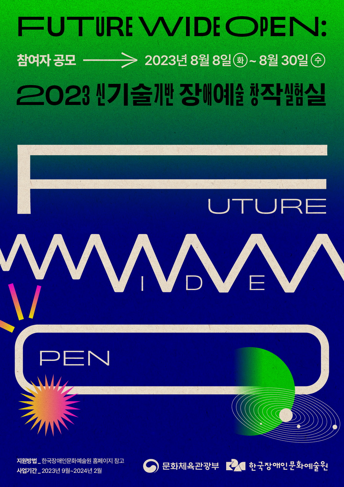 1) 공모개요 한국장애인문화예술원의 「Future Wide Open : 2023년 신기술기반 장애예술 창작실험실」은 장애예술과 기술의 지속적인 협력과 실험이 일어날 수 있도록 공모를 통해 선정된 참가자의 프로젝트 개발비를 지원합니다. 멘토링, 워크숍 등 개발지원 프로그램을 운영하며 작품의 쇼케이스 기회를 제공합니다. 장애 여부, 기술 활용 역량, 창제작 경험 등 개인의 특성에 따라 맞춤형 매니지먼트를 제공하므로, 융합장애예술 창작에 관심 있는 예술가들의 많은 참여 바랍니다. — 2) 지원유형 1. 트랙 WIDE ▶️대상 - 장애예술인 및 장애예술단체 ※비장애예술인(단체) 신청 불가 ▶️지원 목적 - 장애예술인과 기술 전문 제작자의 매칭을 통해 장애예술인에게 융합예술 창작과 구현을 위한 기회 제공 ▶️지원 규모 - 최대 1천 5백만원 및 기술 지원 제공 ※기술지원 비용은 장애예술인(단체)에게 지급되지 않고 기술진, 장비/공간 등에 직접 지급됩니다. 2. 트랙 OPEN ▶️대상 - 장애예술인 및 장애예술단체, 비장애예술인 및 비장애예술단체 ▶️지원 목적 - 융합장애예술작품의 구현이 가능한 장애예술인 및 비장애예술인을 지원해 완성도 높은 작품 개발 ▶️지원 규모 - 최대 5천만원 ※프로젝트를 어떤 트랙으로 지원해야 할지 판단하기 어려울 경우 이메일 혹은 전화번호로 문의주세요! ▶️공통지원내용 - 신기술 활용 워크숍\, 창제작 멘토링\, 네트워킹 등 개발지원프로그램 제공 - 쇼케이스를 통하여 작품을 공유할 수 있는 기회 제공 (2024년 2월 예정) ※ 계약을 통한 지원금 지급 방식으로 진행 — 3) 지원서류 - 지원신청서 1부(필수) - 개인정보동의서 1부(필수) - 포트폴리오 1부(선택) 4) 접수기간 ▶️ 2023년 8월 8일(화) \~ 8월 30일(수) 5) 접수방법 ▶️이메일 접수 futurewideopen@kdac.or.kr 지원서류를 압축파일 1개로 지원자(단체)명 넣어 제출 — 6) 서류심사 발표 ▶️ 9월 10일 전후 ▶️ PT ·면접 심사 일정 개별 안내 (예정) 7) 최종 선정자 발표 ▶️9월 중순, 개별 연락 (예정) — 8) 문의사항 - 이메일 futurewideopen@kdac.or.kr - 전화번호 02-760-9766 자세한 내용은 링크를 확인해주세요 https://www.i-eum.or.kr/board/read?boardManagementNo=29&boardNo=3383&searchCategory=&page=1&searchType=&searchWord=&level=2&menuNo=45
