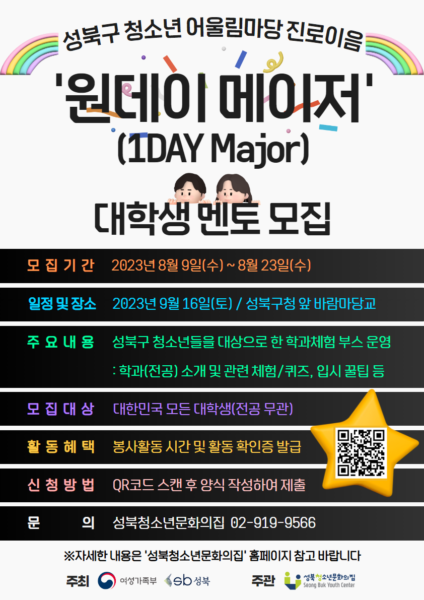 '원데이 메이저(1DAY Major)'는 진로를 주제로 다양한 학과에 재학중인 대학생 멘토(후기 청소년)들이 자신의 학과(전공)에 대한 정보를 후배 청소년들에게 알려주는 진로체험 축제입니다. 이에, 학과 체험 부스를 운영할 대학생 멘토를 모집하고 있으니, 많은 관심과 참여 바랍니다! ✔ 모집대상 - 대한민국 모든 대학생 ※전공무관 - 평소 프로그램 및 행사 기획이나 운영에 관심있던 대학생 - 청소년과 함께하는 대외활동에 참여하고 싶은 대학생 ✔ 모집일정 : 2023년 8월 9일(수) \~ 8월 23일(수) ✔ 활동일자 : 2023년 9월 16일(토) ※시간 별도 공지 예정 ✔ 활동장소 : 성북구청 앞 바람마당교 ✔ 주요내용 - 성북구 청소년들을 대상으로 한 학과체험 부스 운영 - 학과(전공) 소개 및 관련 체험/퀴즈 등 활동 - 입시 및 대학 생활 관련 꿀팁\, Q&A 등 ✔ 활동혜택 - 봉사활동 시간 및 활동 확인증 발급 ✔ 지원방법 : 포스터 내 QR코드 인증 후 신청서 작성(https://forms.gle/LNJENysk1S3pY3Va7) 📢 모집 이후 오픈채팅방을 개설하여 공지사항 등을 전달할 예정입니다. 참고 바랍니다! ✔ 문의 : 성북청소년문화의집 02)919-9566