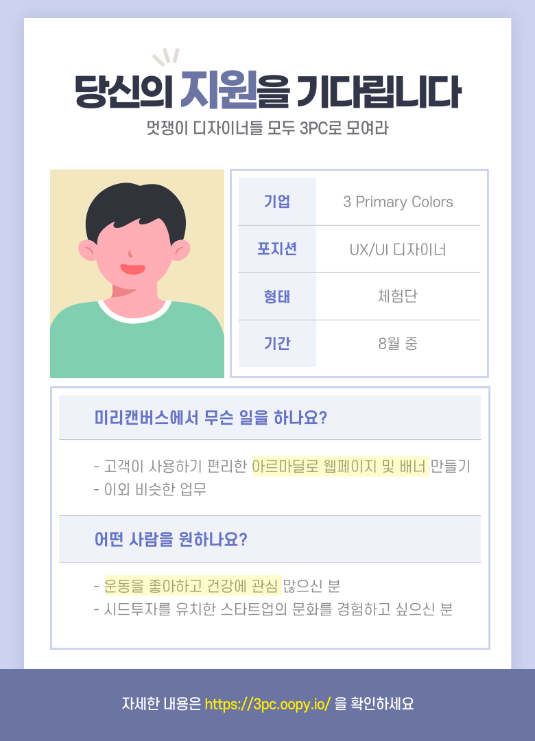3 Primary Colors는 많은 사람들과 사회에 건강을 선물하고자 합니다. 같은 꿈을 갖고 있는 동료를 찾아 앞으로 달려나가고 싶어요 :)