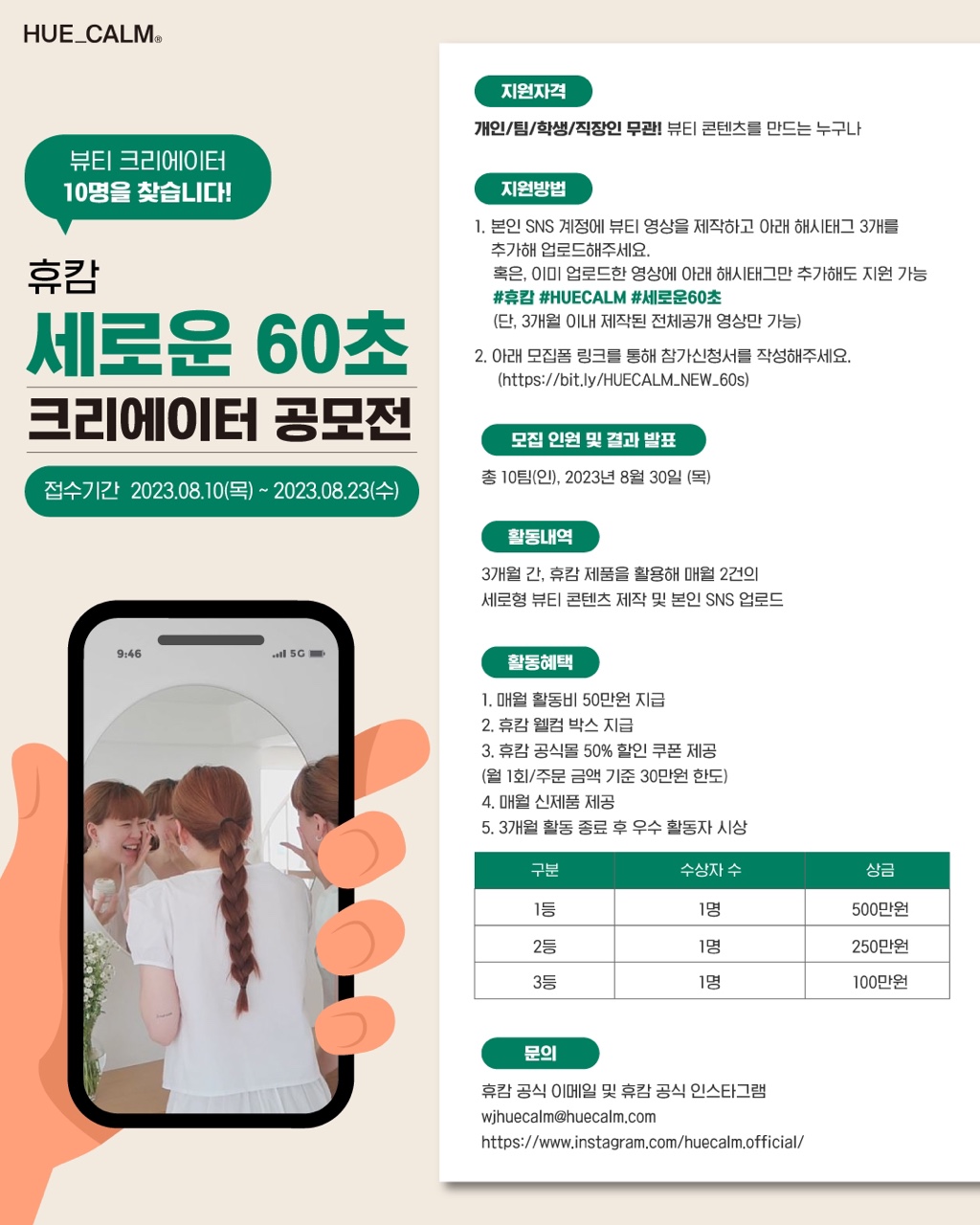 ▶참가대상: 학생, 직장인, 개인, 팀 상관없이 내국인, 외국인 누구나 ▶공모기간: 2023년 8월 10일 (목) \~ 8월 23일 (수) ▶참여방법 ① 필수 해시태그인 #휴캄 #HUECALM #세로운60초 와 함께 개인 SNS 채널에 참가 영상 업로드 ② 참가 신청서 작성 👉 https://bit.ly/HUECALM_NEW_60s ▶10팀 발표: 2023년 8월 30일(목) ▶활동내용 활동기간 3개월간 매 월 2편의 세로형 뷰티 콘텐츠 제작하고 본인 SNS에 업로드하면 끝! 3개월 후, 활동 영상을 토대로 총 3명의 우수자 상금 시상 ▶우수자 시상 내역 총 상금 850만원 (3명) 1등 (1명) 500만원 2등 (1명) 250만원 3등 (1명) 100만원