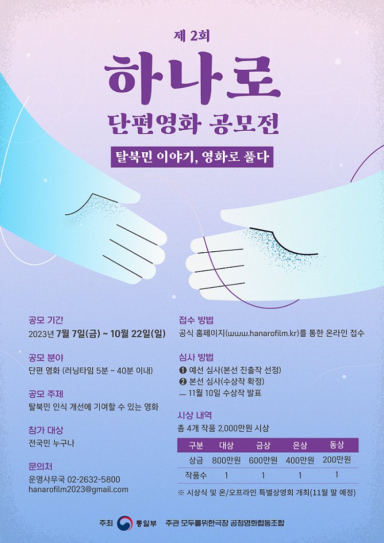 ‘하나로 단편영화 공모전’은 탈북민에 대한 긍정적 인식을 가질 수 있는 탈북민 소재 단편영화 공모전을 개최를 통해 국민들의 탈북민에 대한 이해와 공감대를 확산하며, 탈북민 소재 신규영화 창작자 및 콘텐츠를 발굴하고 영화인들의 탈북민 및 통일문제에 대한 관심 제고를 목적으로 합니다.