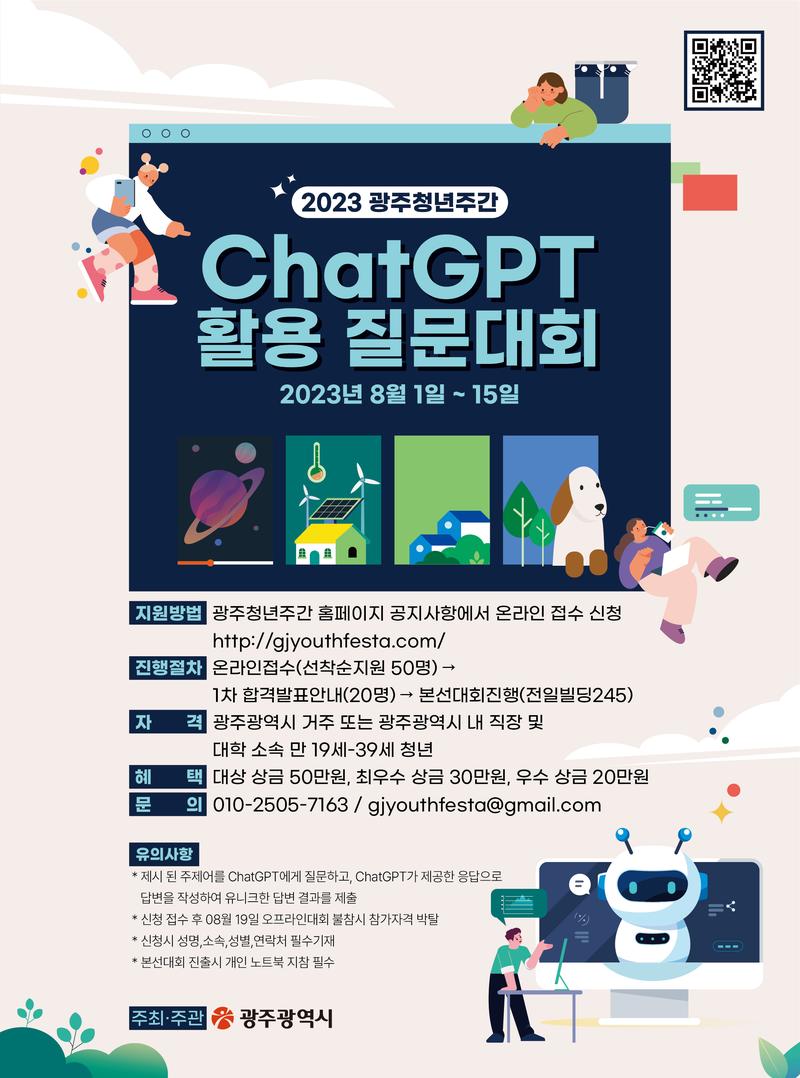 무엇을 상상하든 그 이상의 질문과 답변을 찾아라. 지금까진 이런 대회는 없었다. Ai 시대에 우리는 답을 찾기보다 무엇을 질문할지를 고민해야 하기에 청년과 함께 시작해보는 Chat GPT 질문대회. 최초의 대회에서 최초의 수상자가 되어보세요. 광주의 청년이라면 누구든 무엇이든 질문할 수 있는 존재이기에 당신에게 기회는 열려있습니다. ㆍ자격 : 광주광역시 거주 또는 광주광역시 내 직장 및 대학 소속 만 19세-39세 청년 ㆍ모집기간 : 2023.08.01.-08.15 ㆍ지원방법 : 광주청년주간 홈페이지 공지사항에서 온라인 접수 신청 http://gjyouthfesta.com/ ㆍ혜택 : 상금 (대상 50만원, 최우수 30만원, 우수 20만원) ㆍ문의 : 010-2505-7163
