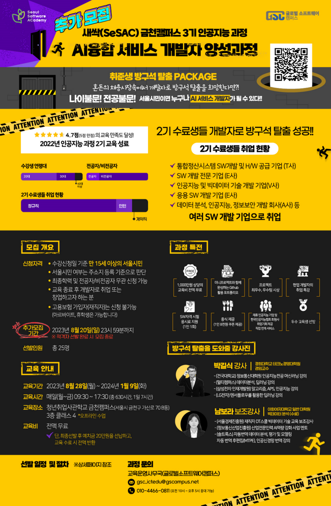 추가 모집 기간이 얼마 남지 않았습니다. 본 교육에 관심이 있으신 분들은 기한 내 신청바랍니다. ☞신청 바로가기: https://bit.ly/SeSAC_ai3_gsc