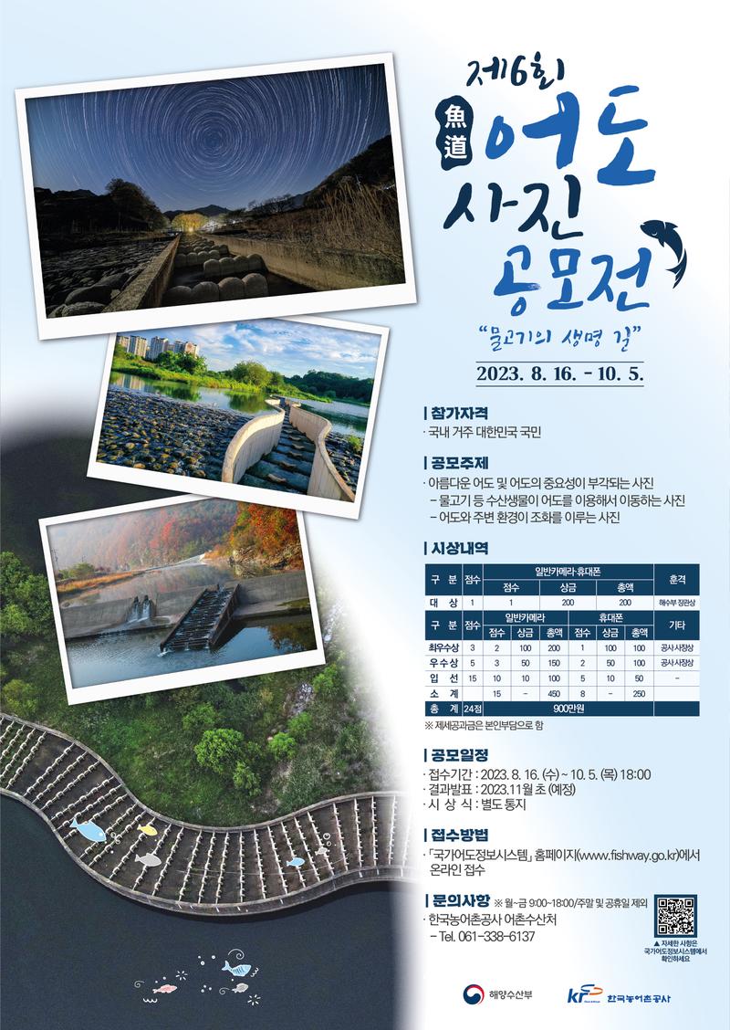 ◼ 공모주제 - 아름다운 어도 및 어도의 중요성이 부각되는 사진 * 물고기 등 수산생물이 어도를 이용해서 이동하는 사진 * 어도와 주변 환경이 조화를 이루는 사진