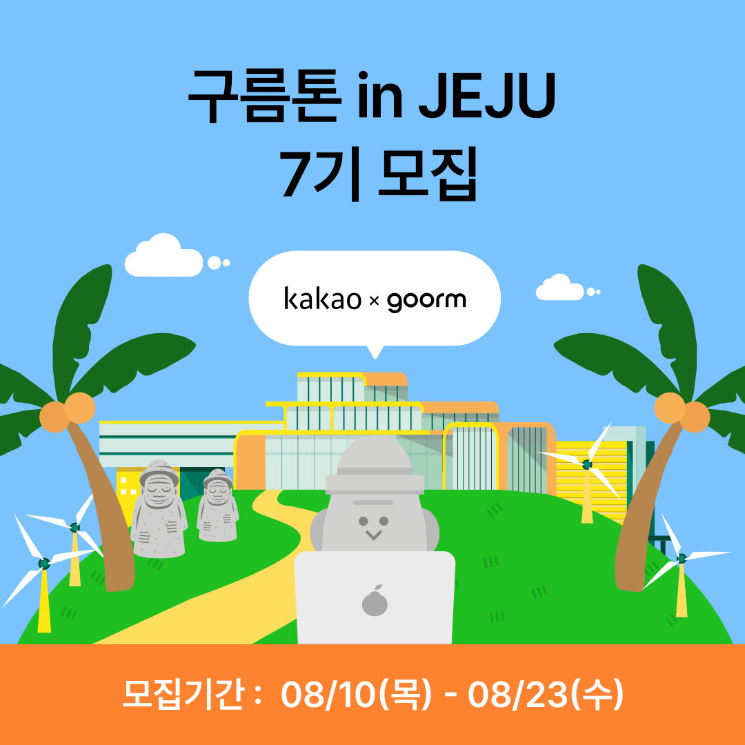 카카오와 구름이 제주에서 {개발자, 디자이너, 기획자}를 찾습니다! 3박 4일 동안 현직 카카오 개발자와 제주 카카오 사옥에서 프로젝트를 완성할 수 있는 기회✨ 개발과 배포 중심의 실전형 개발 캠프를 찾으셨다면 9oormthon을 놓치지 마세요.