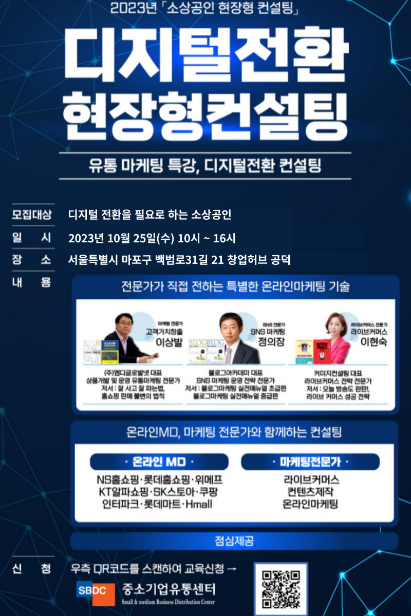 ■ 프로그램 내용 - 디지털 전환\, 온라인 시장진출 및 마케팅 관련 특별강의 - 시장현황\, 가격설정\, 상품 디자인\, 콘텐츠\, 판매전략 등 전문가 컨설팅 - 국내 온라인 쇼핑몰 MD 및 온라인 유통 전문가 상담회 지원 (대기업 현직 MD 및 마케팅 운영전략 전문가의 맞춤 컨설팅 무료 지원) - 장소: 서울특별시 마포구 백범로31길 21 서울창업허브. 서울복지타운(창업허브 공덕)