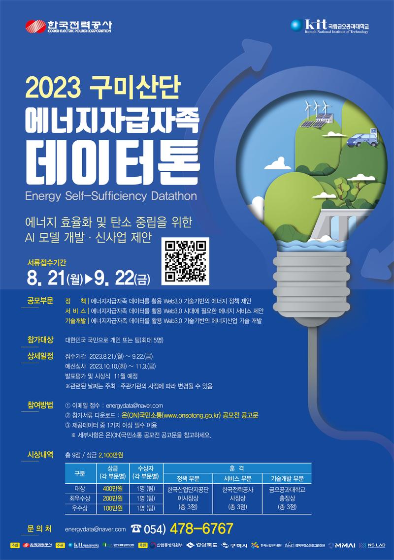 '한국전력공사'가 주최하고 '금오공과대학교 ICT융합특성화연구센터'가 주관하는 『제1회 구미산단 에너지자급자족 데이터톤』을 개최하오니 많은 참여 바랍니다.