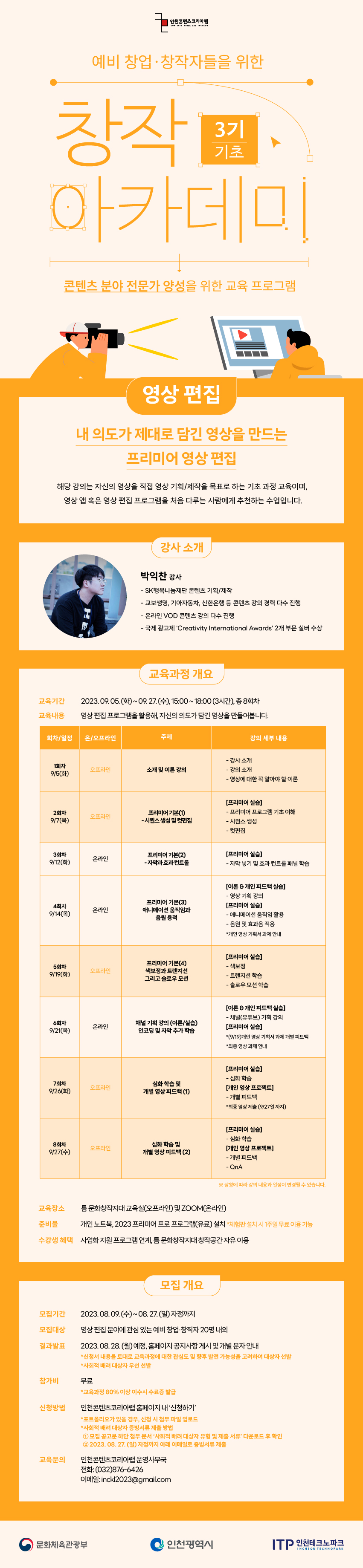 ▶ 교육문의: 인천콘텐츠코리아랩 운영사무국 032-876-6426 / 010-9094-5670 inckl2023@gmail.com