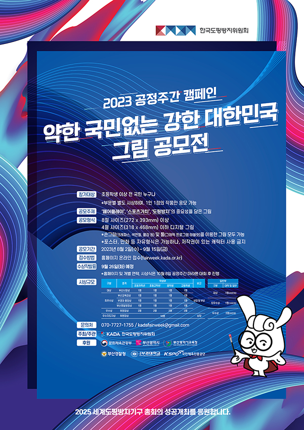 ● 공모 주제 ‘페어플레이’, ‘스포츠가치’, ‘도핑방지’의 중요성을 담은 그림 - 공정한 경쟁(페어플레이)과 깨끗한 스포츠 - 스포츠를 즐기는 건강한 모습 - 스포츠와 함께하는 더 나은 대한민국의 미래 모습 - 불법약물(마약 포함) 근절 - 스포츠와 관련된 자유 주제