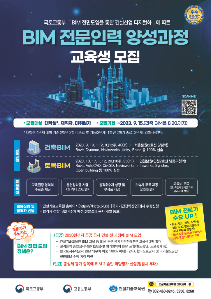 ㅇ 문의 - ☏ 032-460-0245, 0256, 0268 또는 카카오톡 채널 '건설기술교육원 BIM교육(https://pf.kakao.com/_MlyTd)'