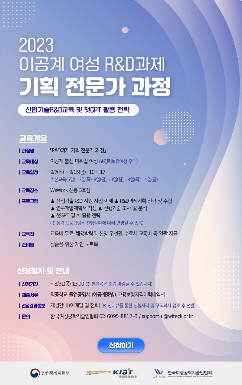 3. 교육대상 : 이공계 출신 여성 중 미취업자 40명 (★경력보유여성 우대) 02. 교육 프로그램 1. 정부R&D 지원 사업 프로세스 (과제기획/ 과제수행/ 성과관리) 2. 과제기획전략 (산업기술R&D전략/ 선행기술조사/ 기술경쟁력분석 ) 3. R&D전략수립체계 (기술로드맵 및 전략) 4. 연구개발계획서 작성 및 우수 사례 벤치마킹 5. 챗GPT 활용 전략 ☆ 실습을 위한 개인 노트북 지참 필수 ※ 상기 프로그램은 진행상황에 따라 변경될 수 있음 03. 모집개요 1.신청,접수기간 : \~08.31(목) 13:00 2. 신청방법 : 온라인 신청 (https://forms.gle/jndDgi5jxsjeytWp9) 3. 제출서류 : 졸업증명서\, 고용보험 자격 이력내역서 (support-u@witeck.or.kr) 4. 교육생 선발 : 신청서 및 인터뷰를 통해 신청 자격 및 구직의사 검토 5. 선발 결과 : 09.04 <선정 결과 개별 통보> 6. 교육 비용 : 무료 04. 수료생 특전 1. 강의 80%이상 출석 시 수료증 발급 2. 2023 인턴십(채용) 연계 우선 지원 : (360만원/1\~3개월) \~23.12월까지