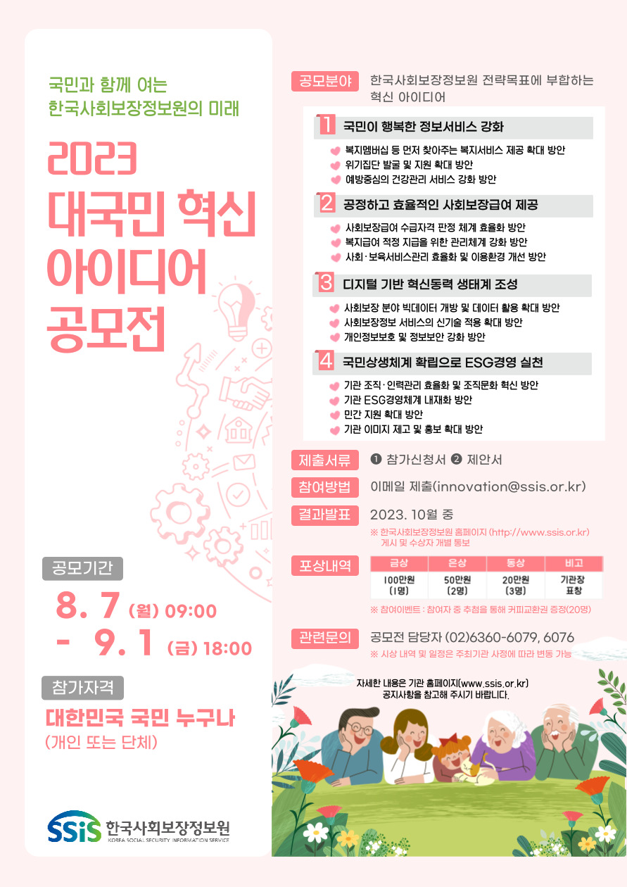 국민 중심의 혁신과제 발굴 및 기관 운영 반영으로 국민이 체감할 수 있는 혁신성과를 창출하고자 「2023년 대국민 혁신 아이디어 공모전」을 추진합니다. 많은 관심과 참여 바랍니다.