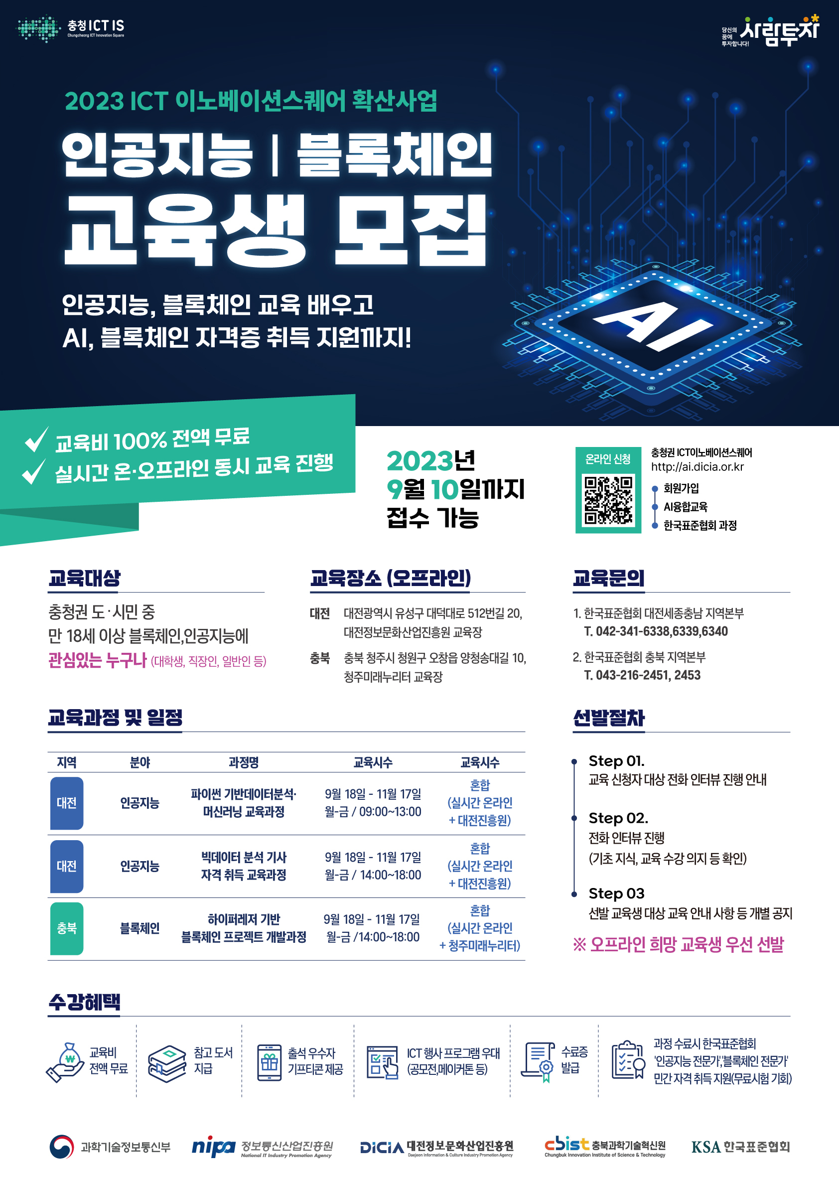 한국표준협회 충청권 ICT이노베이션 스퀘어 사업 관련 인공지능 및 블록체인 무료교육 교육생을 모집하오니 많은 지원과 관심 바랍니다.