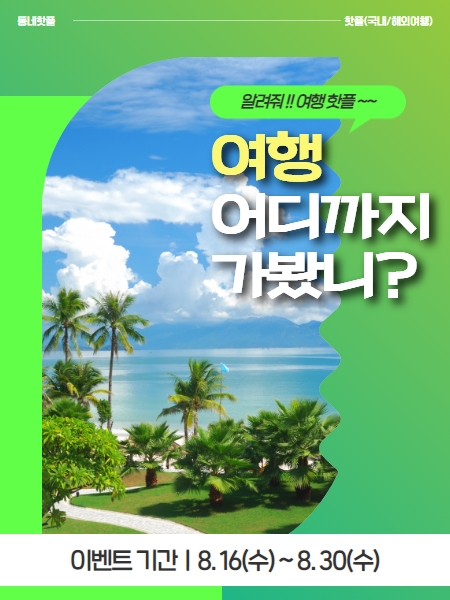 📢 동네핫플 '핫플' 이벤트 [ 알려줘\~\~ 여행핫플!! ] 국내, 해외여행... 어디까지 가봤니? 내돈내산 여행지 중 추천하고 싶은 장소를 알려주세요 ! + 여행에 필요한 꿀팁까지 공유해주면 너무 좋아요 👍🏻