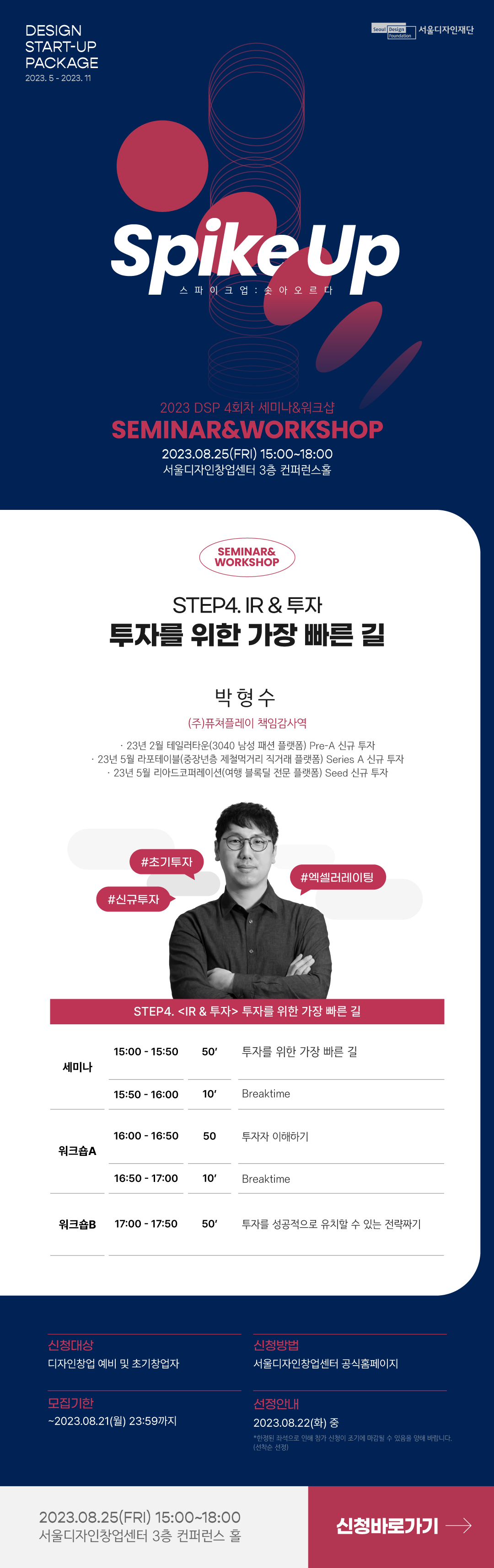 서울디자인창업센터 8월 워크샵&세미나에서는, (주) 퓨쳐플레이 책임감사역이신, 박형수 감사역님과 함께 투자자를 이해하고, 성공적으로 투자를 유치하는 방법에 대해 알아 볼 예정인데요!