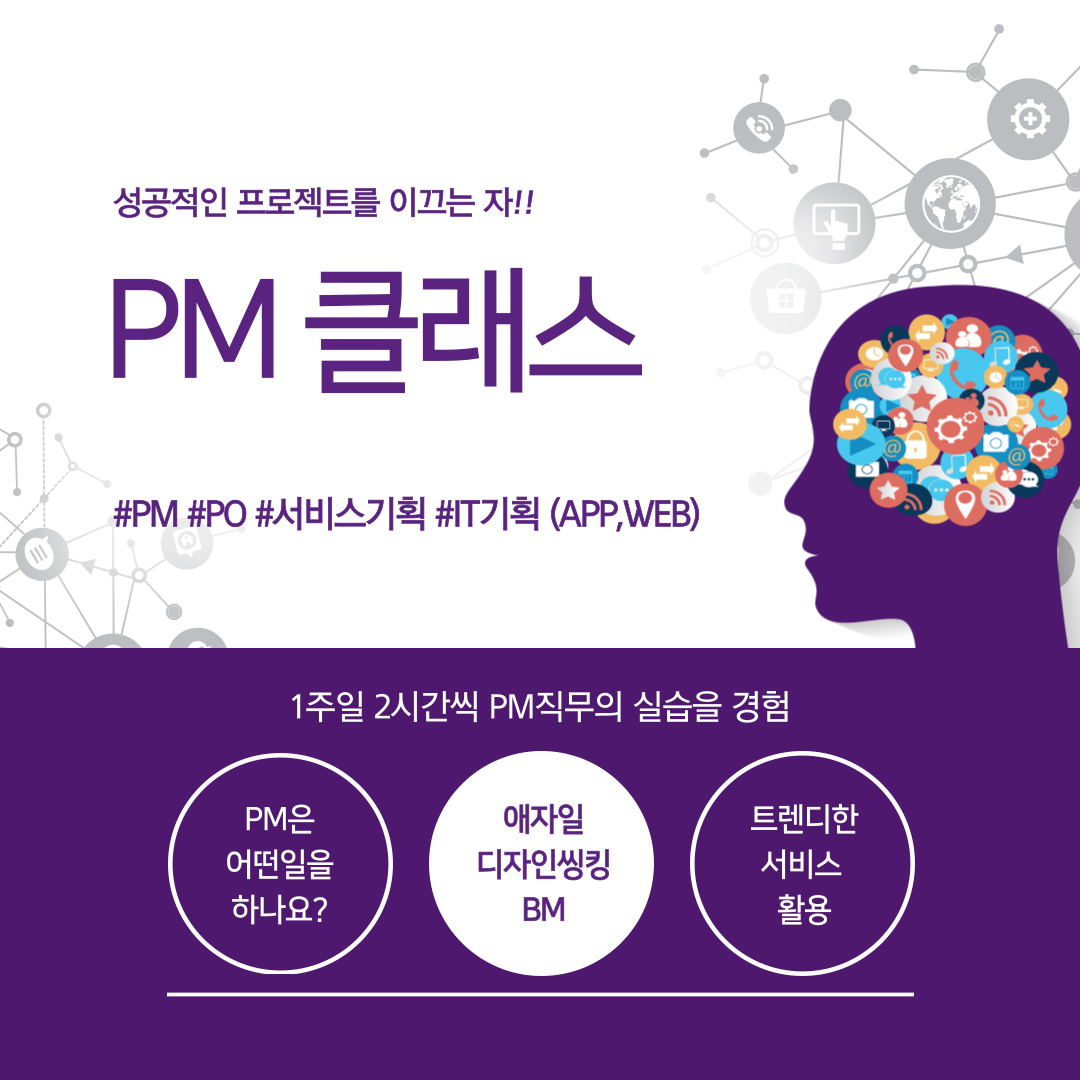 📢 PM클래스란? ● IT업계 PM은 어떤 일을 하는지 실무의 과정을 이론과 실습을 통해 진행합니다. - 한 개의 프로젝트 시작부터 운영까지 책임을 지는 PM의 실무를 배웁니다. - 5주간 기존 PM들의 운영부터 최근 트렌디한 서비스 활용을 배워 적용하세요! - PM의 자질과 역할에 대해 확실하게 배울 수 있는 클래스입니다. - 1주일 2시간 시간내서 실력있는 PM으로 도전하세요! ● 이런 분이 들으시면 좋아요! 1. PM이 되고싶으나 경험이 필요하신 분 2. 최근 활용 툴을 사용하여 운영을 배우고 싶은 분 3. PM이 되고 싶은 취준생\, 이직을 꿈꾸시는 분