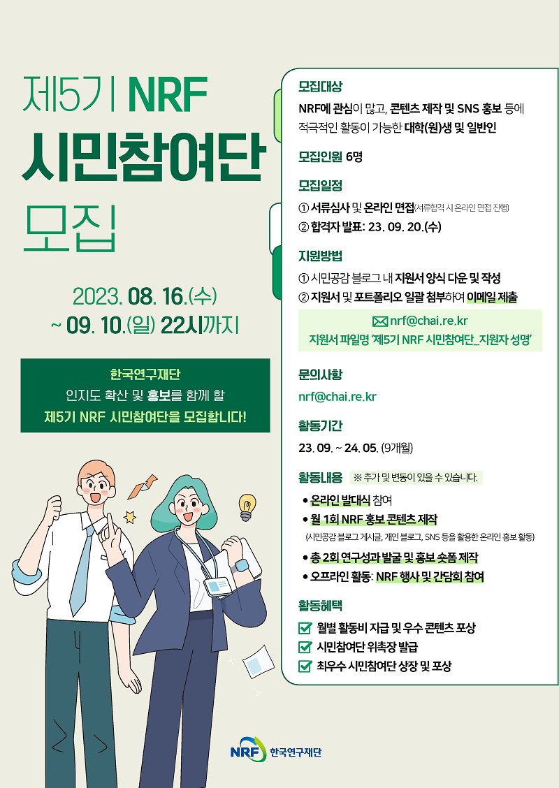 ◎ 지원방법 - 1단계 : 시민공감 블로그 내 제5기 NRF 시민참여단 모집 공고에서 지원서 양식 다운로드 (https://blog.naver.com/nrfcitizen/223184847298) - 2단계 : NRF 시민공감 블로그 이웃 추가 및 SNS(페이스북\, 인스타그램\, 유튜브) 팔로우 - 3단계 : 지원서 및 포트폴리오 이메일 제출(nrf@chai.re.kr) ※ 파일명 : 제5기 NRF 시민참여단_지원자 성명
