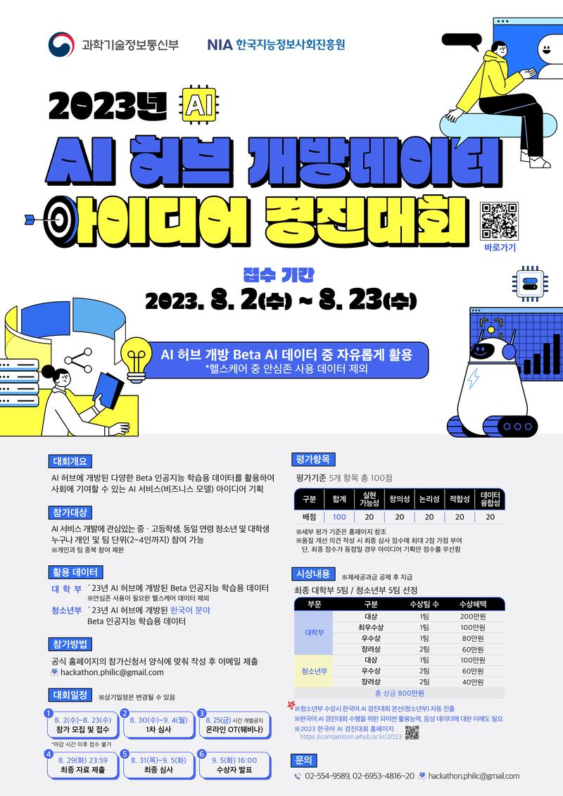 제목 : [한국지능정보사회진흥원] `23년 AI 허브 개방데이터 아이디어 경진대회 (\~8/23) ♣ 대회명 : `23년 AI 허브 개방데이터 아이디어 경진대회 ♣ 개최 목적 : 1) `23년 AI 허브 개방데이터의 인지도 제고 및 활용 촉진과 AI 데이터 저변 확산을 통한 AI 산업계 인재 양성 도모 2) AI 데이터 활용 문화 조성과 더불어 혁신적인 아이디어 발굴 ♣ 공모주제 : AI 허브에 개방된 다양한 Beta 인공지능 학습용 데이터를 활용하여 사회에 기여할 수 있는 AI 서비스(비즈니스 모델) 아이디어 기획 ♣ 참가대상 : 인공지능, AI 데이터, 데이터 기반 AI 서비스 개발에 관심 있는 중 · 고등학생, 동일 연령 청소년 및 대학생 누구나(개인 또는 1\~4인 팀) ♣ 공모부문 : 1) 대학부 : `23년 개방 Beta 인공지능 학습용 데이터 활용 서비스 아이디어 기획 - 타 분야 Beta AI 데이터를 융합한 아이디어 기획 가능 / ※ 안심존 사용 헬스케어 데이터 제외 2) 청소년부 : `23년 개방 한국어 Beta Ai 데이터 활용 서비스 아이디어 기획 - 다수의 Beta 한국어 AI 데이터를 융합한 아이디어 기획 가능 ♣ 참가접수기간 : 2023. 8. 2(수) \~ 8. 23(수) 23:59 까지 (기한 연장) ★ 마감시간 이후 제출자료는 인정하지 않습니다. ♣ 접수 방법 및 제출 서류 : 1) 홈페이지 내 양식 다운로드, 작성 후 이메일 제출(hackathon.philic@gmail.com) 2) 참가신청서 및 기획안 1부 / 참가서약서 1부 / 개인정보 수집 및 이용 동의서 1부 ♣ 평가항목 : 실현가능성 / 창의성 / 논리성 / 적합성 / 데이터 융합성, 5개 항목 총합 100점 ※ 데이터 융합성 항목 : AI 데이터 활용 개수 및 근거자료에 따라 차등배점 적용 ※ 가점항목 : AI 데이터 품질 개선 의견 작성 시 최대 2점 가점 부여 / 최종 점수가 동점일 경우 아이디어 기획안 점수를 우선하여 순위배정 ♣ 대회 일정 1) 참가자 모집 마감 : 2023. 8. 2. (수) \~ 8. 23. (수) 23:59 2) 온라인 OT : 8. 25. (금) (시간 개별 공지) 3) 최종 자료 제출 마감 : 8. 29. (화) 23:59 4) 최종 심사 : 8. 30. (수) \~ 9. 4. (월) 5) 수상자 발표 : 9. 5. (화) 16:00 ♣ 시상규모 : 총 800만원 대학부 : 5팀 / 500만원 청소년부 : 5팀 / 300만원 ※ 결과에 따라 기준미달로 적합한 기획안이 없을 경우 시상내역은 조정될 수 있으며, 상금은 제세공과금 공제 후 지급 ♣ 청소년부 특전 청소년부 수상팀은 2023 한국어 AI 경진대회 청소년부 본선 자동진출 / 10월 중순 진행 예정 ( https://competition.aihub.or.kr/2023) ※ 원활한 대회 진행을 위한 파이썬 활용능력, 음성 데이터에 대한 이해도 필요 ♣ 문의 http://www.aihub-ideacontest.co.kr/ 이메일 : hackathon.philic@gmail.com / 전화 : 02-554-9587, 02-6953-4816\~20 ♣ 참가신청서 다운로드 : `23년_AI_허브_개방데이터_아이디어_경진대회_제출서류_양식(참가신청서_등).hwp (67.383 KiB)**