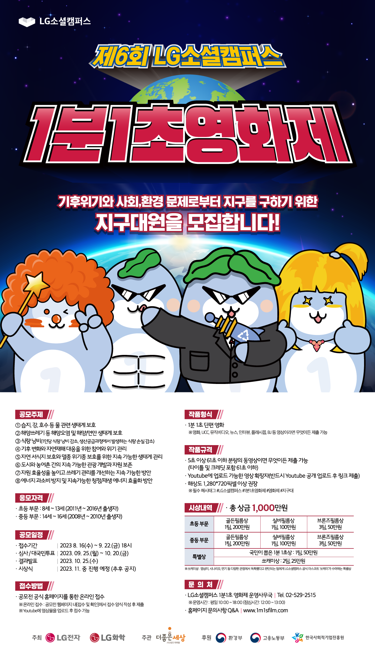 [문의처] 제6회 LG소셜캠퍼스 1분1초영화제 운영사무국 - Tel. 02-529-2515 ※ 운영시간 : 평일 10:00 \~ 18:00 (점심시간: 12:00 \~ 13:00) - 홈페이지 내 커뮤니티 > 1:1 문의
