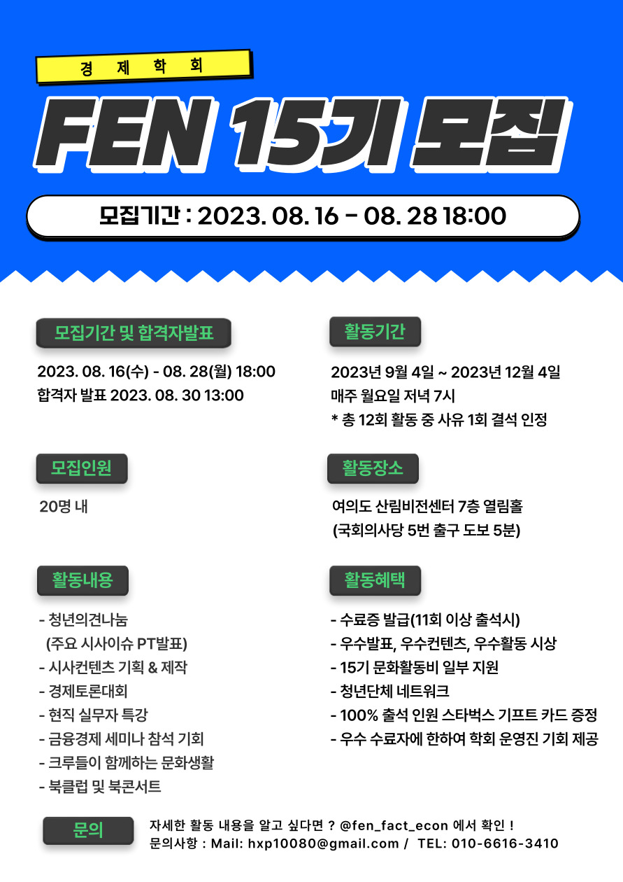 안녕하세요. 경제학회 FEN에서 15기 신입 학회원을 모집하고 있습니다!