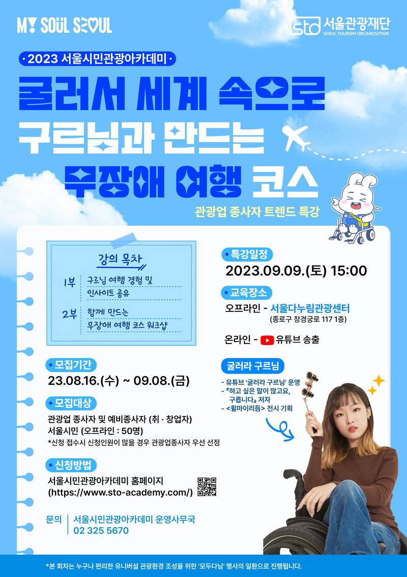 ✅모집기간 : 23.8.16.(수)\~9.8.(금) ✅모집대상 : 관광업 종사자 및 예비종사자 (취/창업자), 서울시민 50명 ✅특강일정 : 23.9.9.(토) 15:00 \~ 17:00 ✅교육장소 : (오프라인) 서울다누림관광센터 / (온라인) 유튜브 송출 * 온라인도 홈페이지에서 사전 신청해주셔야 참여 가능합니다! (인원제한 X)