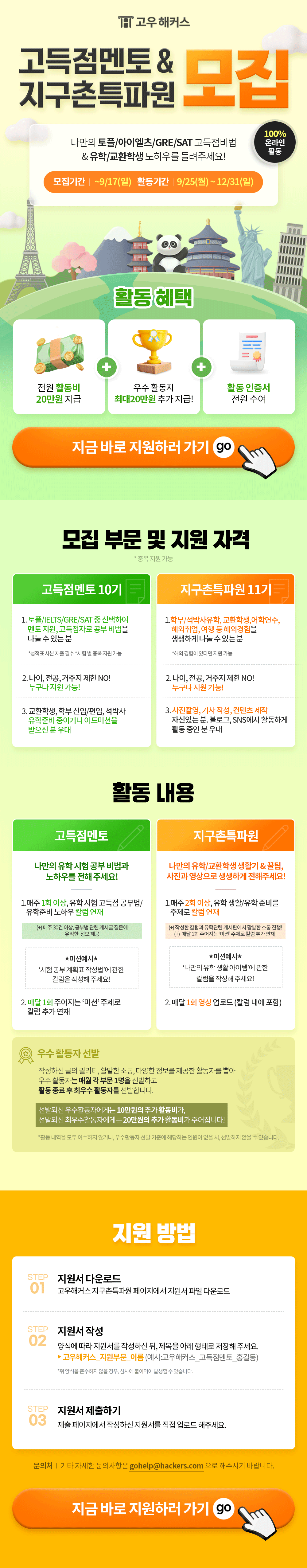 ■ 고득점멘토 10기 고우해커스에서 나만의 유학준비 노하우&유학시험 공부 팁을 전해 주세요! ■ 지구촌특파원 11기 고우해커스에서 현지의 생생한 유학 생활담&유학 정보를 전해 주세요!