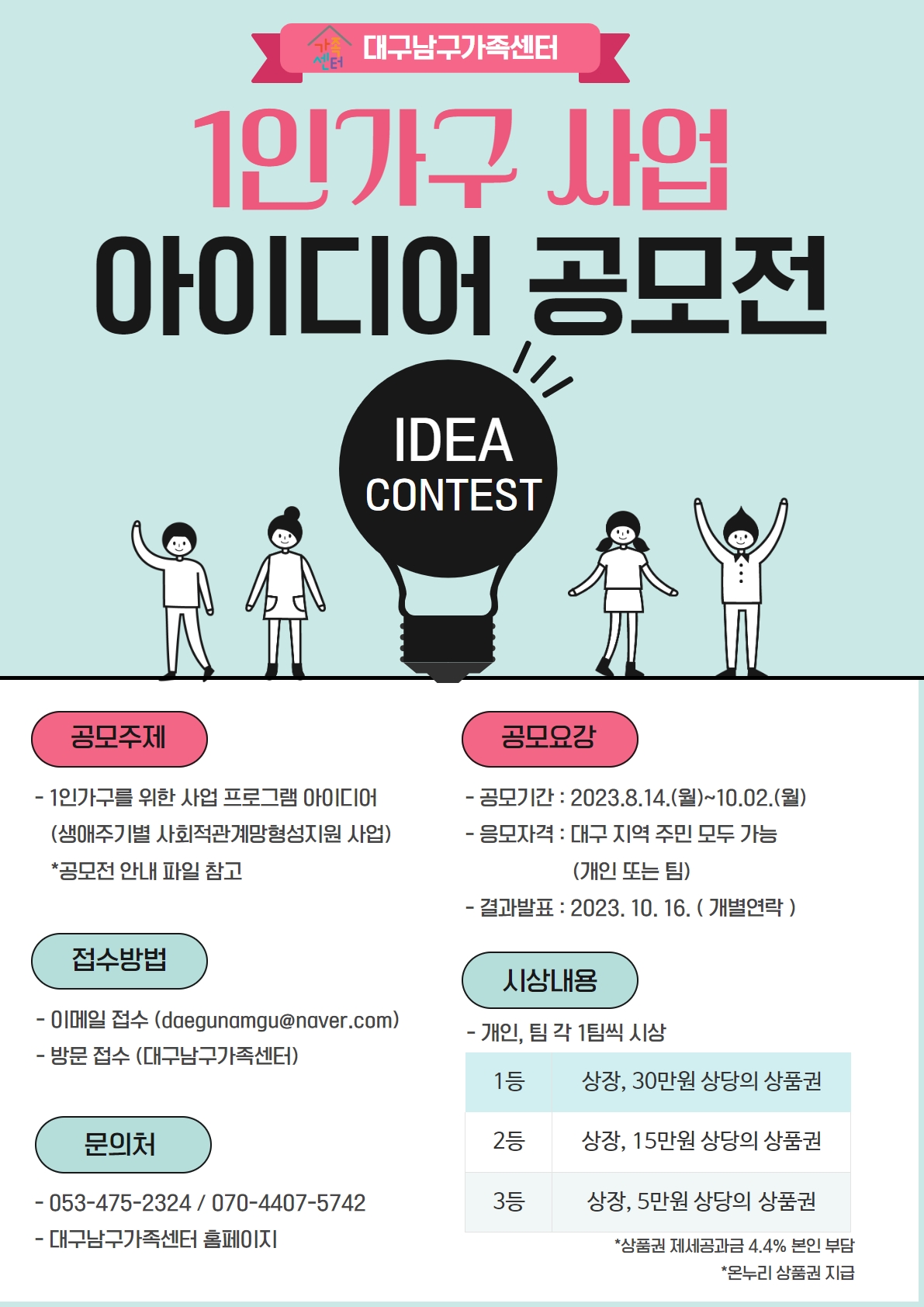 1. 공모주제 - 1인가구를 위한 사업 프로그램 아이디어 (생애주기별 사회적관계망형성지원 사업 아이디어) ▶ 첨부파일(공모전 안내) 목적, 제안내용 예시 참고