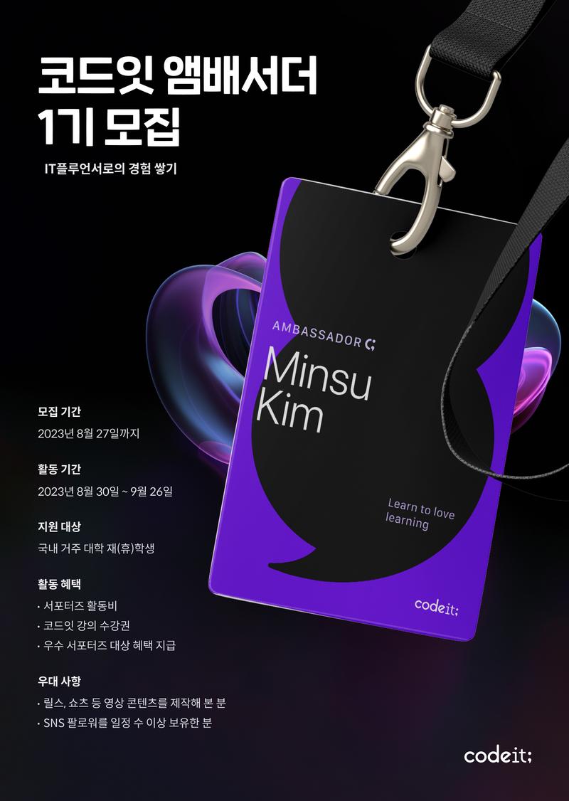 💜 코드잇 대학생 앰배서더 1기 모집 💜 온라인 코딩 교육 구독 서비스 코드잇에서 앰배서더 1기를 모집합니다. 코딩이 처음인 비전공자도, 전공자도 OK! 코딩 공부와 IT 분야에 관심이 있다면 지금 바로 지원해보세요!