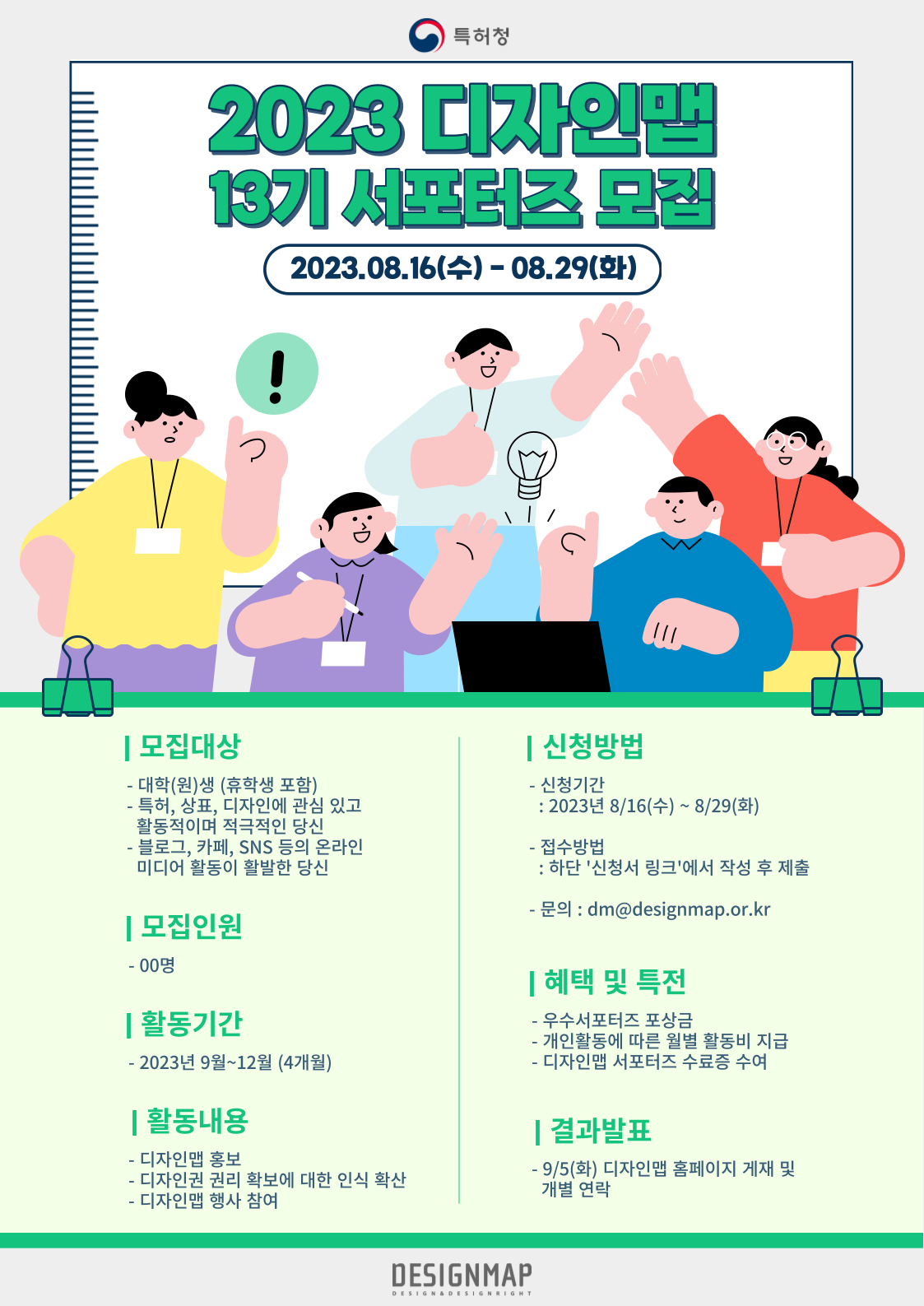 <2023 디자인맵 13기 서포터즈 모집> 특허청 디자인맵에서는 디자인권의 중요성에 대한 인식 재고를 위해 제13기 디자인맵 서포터즈를 모집합니다. 지식재산권에 관심 있는 대학(원)생 여러분들의 많은 관심 부탁드립니다.