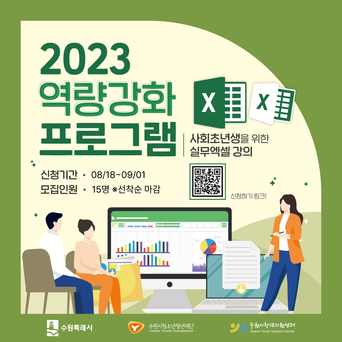 ⠀ 엑셀에 이런 기능이.. 서식, 함수를 통해 엑셀의 유용한 기능을 낱낱이 파헤쳐 보세요 ⠀ 전문 강사님과 함께하는 실무엑셀강의 기초부터 실전에 활용할 수 있는 기능들만 골라 배워볼 수 있어요 ✏️ 접수기간 : 8.18.(금) \~ 9.1.(금) ✏️ 접수대상 : 만 19세 \~ 34세 수원청년 15명 ✏️ 강의일정 : 9.5.(화), 7.(목), 12.(화), 19.(화), 21.(목) / 총 5회 진행 ✏️ 강의시간 : 19:00 \~ 21:30 ✏️ 강의장소: 온라인(ZOOM) ※ 신청자가 많을 시 조기 마감 될 수 있습니다. ※ 노쇼/연락 두절 시 본 센터 프로그램에 영구적으로 제한됩니다. ※ 강의자료는 선정 후 이메일로 보내드릴 예정입니다. ☎ 031- 267-3627