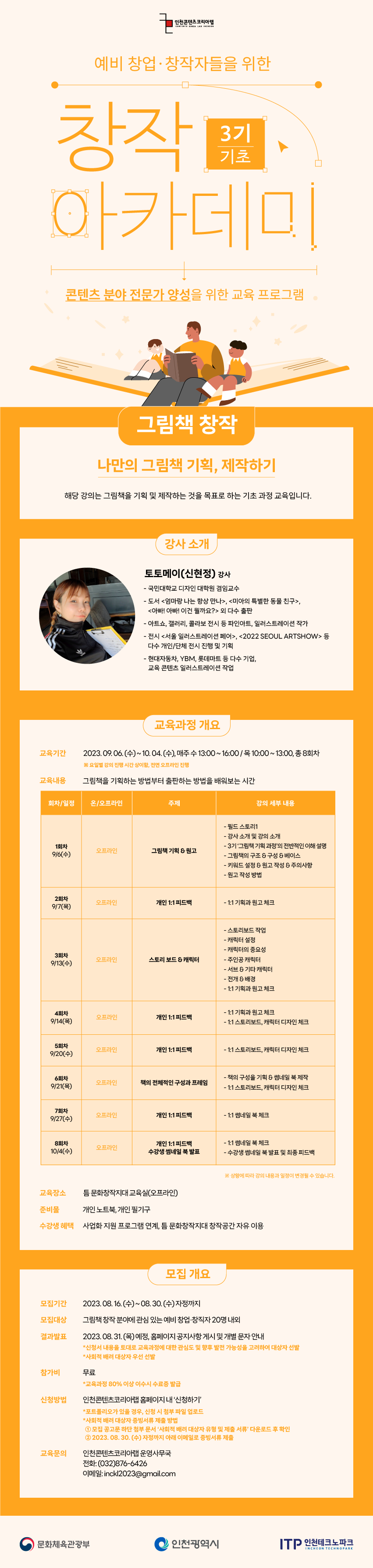▶ 모집기간: 2023. 08. 16. (수) \~ 08. 30. (수) 자정까지 ▶ 모집대상: 그림책 창작 분야에 관심 있는 예비 창업·창직자 20명 내외 ▶ 신청하기: 인천콘텐츠코리아랩 홈페이지 내 신청하기 *포트폴리오가 있을 경우 신청 시 첨부파일로 업로드 *사회적 배려 대상자 증빙서류 제출 방법 - 증빙서류는 모집공고문 하단의 별첨 문서 참조하여 이메일로 제출 - 제출 기한: 2023. 08. 30. (수) 자정까지