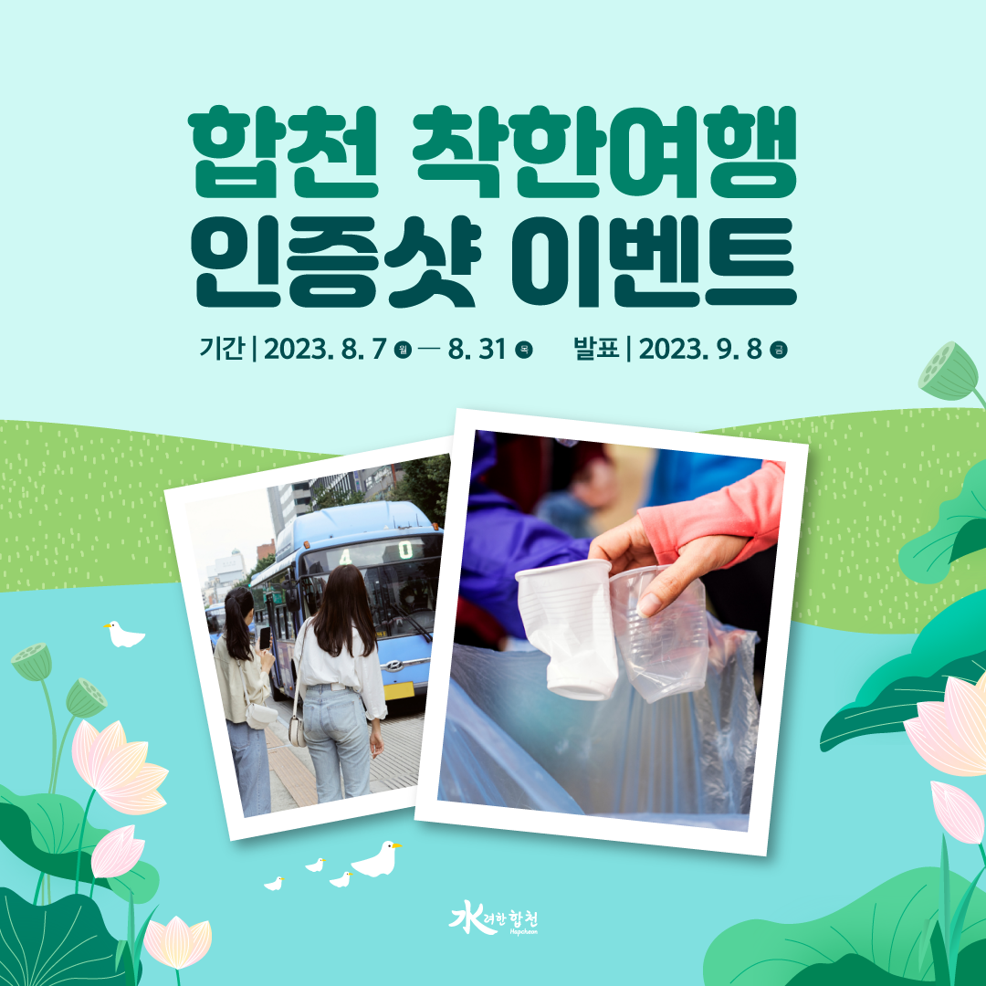 합천 여행을 했을 뿐인데 경품이 와르르 🎁😎 여행도 즐기고, 경품도 받는 특별한 이벤트! 여러분의 많은 참여와 관심 부탁드립니다. 🙏 💌 이벤트 기간 : 8월 7일(월) - 31일(목) 💌 당첨자 발표 : 9월 8일(금) 💌 참여방법 💚 STEP1 : 방법① 또는 방법② 중 택1하여 사진 촬영 ▶ 방법① 음식점 방문, 로컬푸드 및 기념품 구입 등의 합천 여행 소비활동 촬영 ▶ 방법② 합천 여행을 하며 실행한 착한 여행 방법 촬영 예시) 관광지 쓰레기 줍기, 쓰레기 되가져가기, 에코백·텀플러 사용 * 합천에 방문했음을 인증하는 사진 업로드만 이벤트 참여로 간주 * 게시물 업로드 시 방문한 합천 여행지, 맛집 등의 명칭 또는 실행한 착한여행 방법 표기 필수 💚 STEP2 : 필수 해시태그와 함께 개인 인스타그램 또는 페이스북 업로드 ▶필수 해시태그 : #합천_ESG #합천착한여행 #8월_합천착한여행챌린지 💌 이벤트 경품 : 이디야커피 딸기주스R(10명) * 본 이벤트는 월마다 진행됩니다.(6월-11월) * 연간 총괄 우수 참여자를 선정하여 경품 지급합니다.(12월) - 대상 : 다이슨 에어랩(1명) - 금상 : 태블릿 PC(2명) - 은상 : 글램핑숙박권(5명) - 동상 : 관광굿즈 또는 합천특산물(10명)