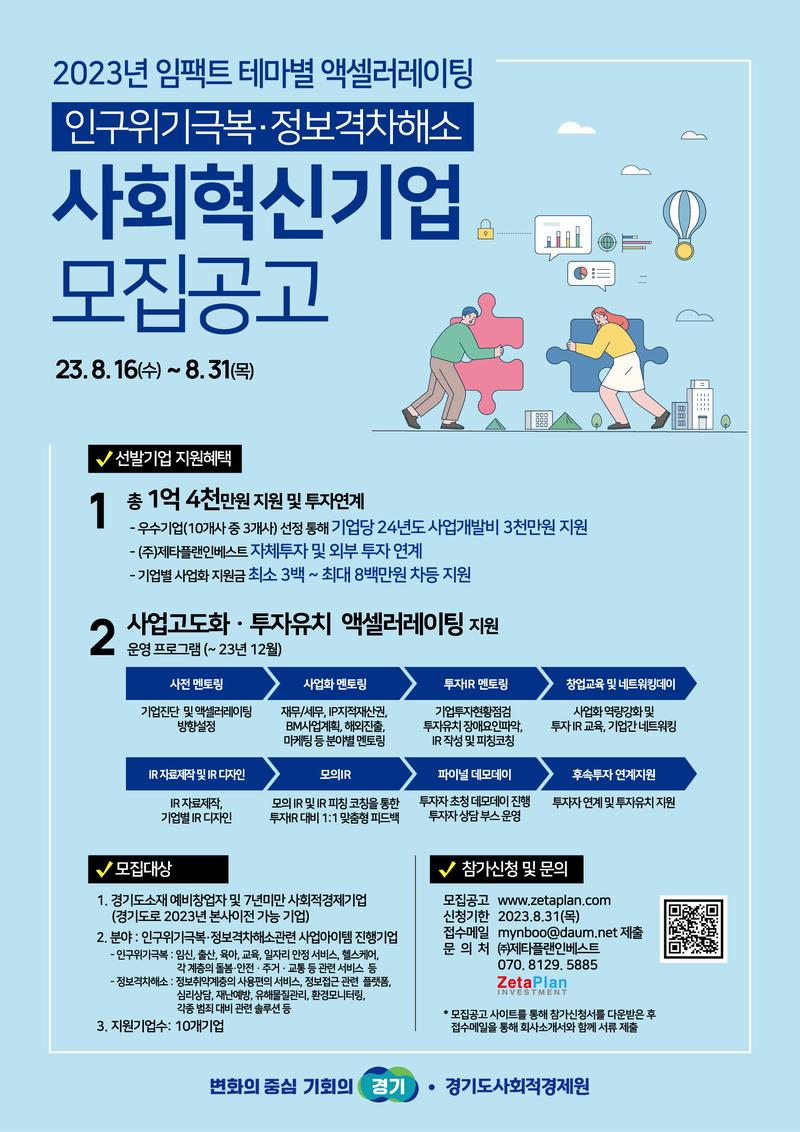 1. 사업개요 ○ [사업목적] 경기도 사회문제해결 사회적경제기업 발굴 및 육성 ○ [사업규모] 인구위기극복·정보격차해소 분야 예비창업팀 및 기업 10개소 ○ [지원내용] 기업 별 맞춤형 교육 및 컨설팅, 창업공간제공, 네트워킹, 사업화지원, BM 검증, IR덱 제작 및 피칭 훈련 등 지원 ○ [참가특전] - 우수팀(10개소 중 3개소) 선정 통해 24년도 사업개발비 3천만원 지원 - ㈜제타플랜인베스트 투자 검토 및 외부 투자 연계 - 기업별 사업화 지원금 최소 3백 \~ 최대 8백만원 차등 지원 2. 모집개요 ○ [모집시기] 2023.8.16.(수)\~ 2023.8. 31.(목) ○ [모집분야] 인구위기 극복 및 정보격차해소 분야 사회적경제기업 ○ [모집선정] 서류 및 발표를 통한 심사선발 (해당기업 별도 안내) ○ [모집대상] 예비창업팀* 및 7년 미만 사회적경제기업** * 창업을 하지 않은 예비창업자 ** 공고일 기준 법인등기부상 소재지자 경기도이거나, 경기도에 본사 이전 예정인 7년 미만인 사회적경제기업(선정 후 23년 이내 본사 이전 필수) - 개인사업자 : 사업자등록증 상 ‘개업연월일’ 기준 - 법인사업자 : 법인등기부등본 상 ‘회사성립연월일’ 기준