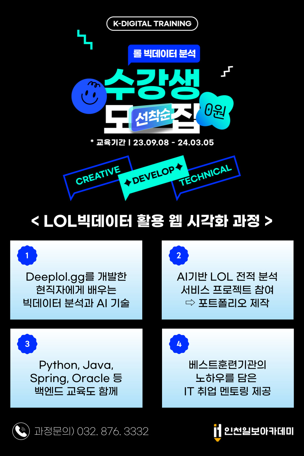 [K-디지털 트레이닝] LOL 게임 빅데이터를 활용한 웹 시각화 양성과정 롤 전적 검색 서비스 Deeplol.gg를 만든 (주)게임아이 개발진과 함께 AI 기반 롤 게임 데이터 분석 서비스 프로젝트를 완성하세요. 빅데이터 전문가의 빅데이터 분석/머신러닝 실무 교육과 프로젝트 멘토링으로 취업 스펙 UP!!