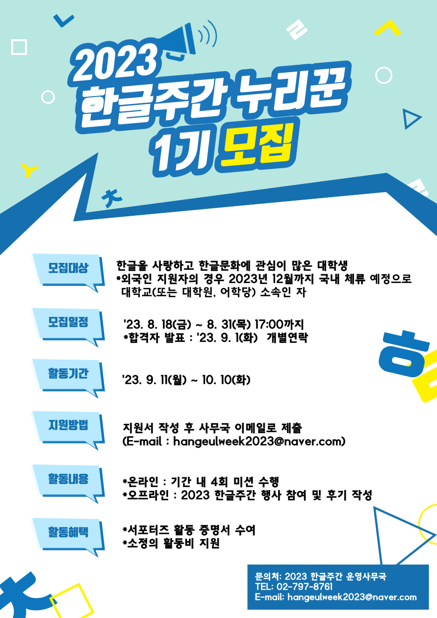💛문의처💛 - 2023 한글주간 사무국 (02-797-8761) - 이메일 (hangeulweek2023@naver.com)
