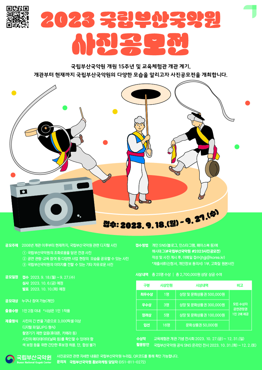 📌 접수방법 개인 SNS에 해시태그(#국립부산국악원 #2023사진공모전)를 포함한 사진 게시 후, 이메일 접수(jhjjj@korea.kr) *제출서류(신청서, 개인정보 동의서) 1부, 고화질 원본사진