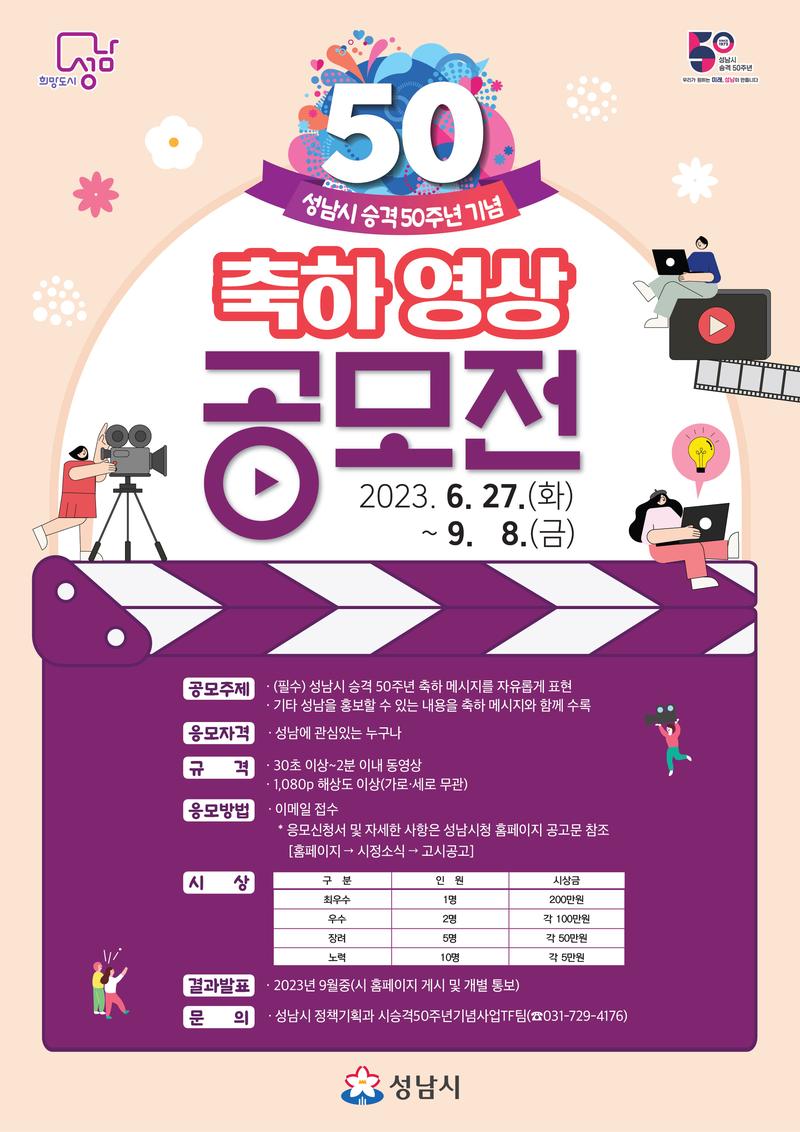 ■ 응모 자격 - 성남에 관심있는 누구나 ■ 응모 주제 - 성남시 승격 50주년 축하 영상 ⦁ (필수) 성남시 승격 50주년을 축하하는 내용을 자유롭게 표현 ⦁ 성남을 홍보할 수 있는 내용(소재)을 축하 메시지와 함께 수록 ■ 시상 내역 - 총 700만원(최우수상 등 18명 선정) ■ 응모 일정 - 공모기간: 2023. 6. 27.(화) \~ 9. 8.(금) 18:00까지 ※ 기간 연장 - 결과발표: 2023. 9월중 (시 홈페이지 게시 및 개별 통보) ※ 개별 통보는 당선자에 한함, 심사일정 지연 시 결과 발표일 조정될 수 있음 ※ 별도 상장 전달 없음 ■ 제출 서류 - 공모신청서 1부, 초상권 사용 동의서 1부, 공모 작품(영상) ■ 접수 방법 - 이메일(dwkim88@korea.kr) 제출 ※ 이메일 '도착' 시간을 기준으로 하며, 마감일 18:00까지 도착해야 함 ※ 날인 한 신청서를 스캔 또는 사진 촬영 후 파일로 제출 ■ 문의 사항 - 성남시청 정책기획과 시승격50주년기념사업추진TF팀(031-729-4176)