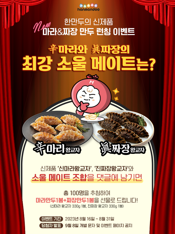 2. 한만두샵 이벤트 페이지 댓글에 소울푸드 2종 '신마라 왕교자'\, '진짜장왕교자'의 소울 메이트 푸드 조합을 댓글로 남겨주세요! ex. 진짜장 왕교자 소울 메이트 푸드는? 매콤 달콤한 떡볶이\~