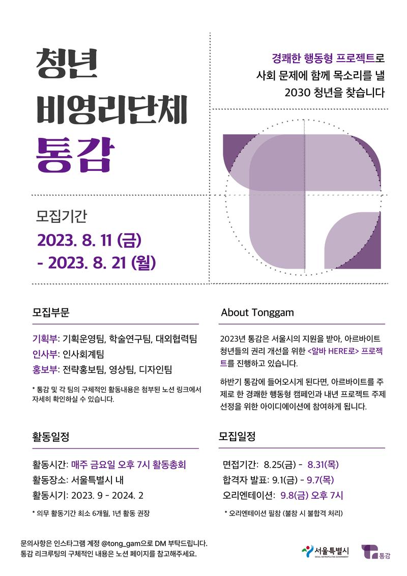 안녕하세요, 경쾌한 행동형 프로젝트를 통해 사회 문제에 목소리를 내는 청년 비영리단체 통감입니다. 2023년 하반기 <알바 HERE로> 캠페인 및 내년 활동 주제 선정을 위한 아이디에이션에 참여할 팀원을 모집합니다!