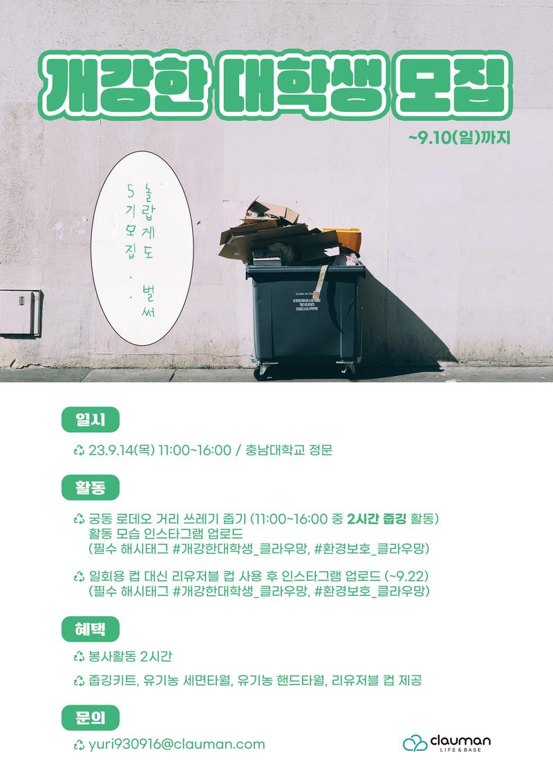 [활동] 1) 궁동 로데오 거리 쓰레기 줍기 (11:00\~16:00 중 2시간 줍깅 활동) 활동 모습 인스타그램 업로드 (필수 해시태그 #개강한대학생_클라우망 , #환경보호_클라우망) 2) 일회용 컵 대신 리유저블 컵 사용 후 인스타그램 업로드(\~9.22까지) (필수 해시태그 #개강한대학생_클라우망 , #환경보호_클라우망)