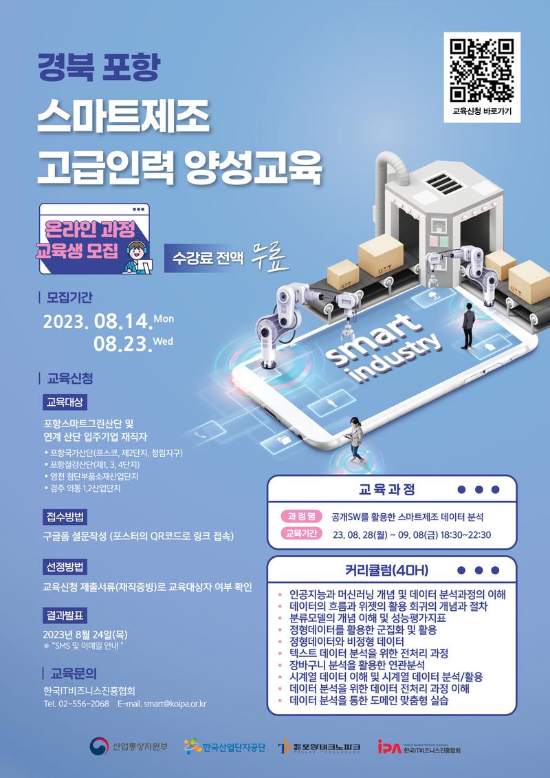 2023년 스마트제조 고급인력 양성교육은 포항산단/ 경주외동산단/ 영천산단 내의 재직자 대상으로 교육생을 모집하고 있습니다. IT 최신 기술 트렌드를 기반으로 한 자동화 기술을 배울 수 있는 좋은 기회이므로 많은 참여 부탁드립니다. 교육 참여 작성 링크: https://docs.google.com/forms/d/1VMzmji03GWEZZJnuVcerpEx8Fj5WvjVM1ULEk6nq_TA/edit