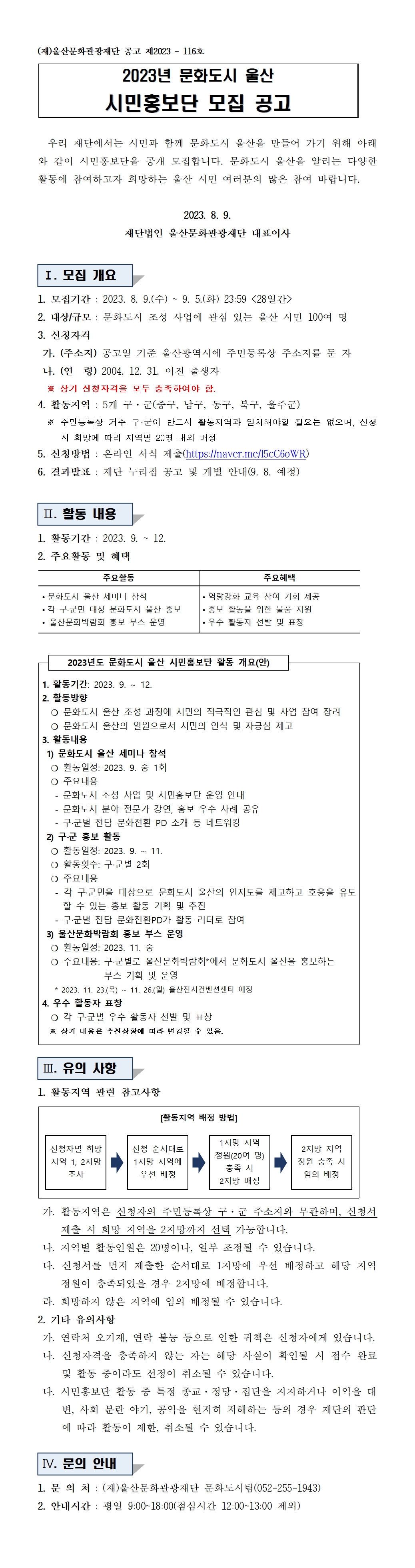 ■ 문의 사항 1. 문 의 처 : (재)울산문화관광재단 문화도시팀(052-255-1943) 2. 안내시간 : 평일 9:00\~18:00(점심시간 12:00\~13:00 제외)