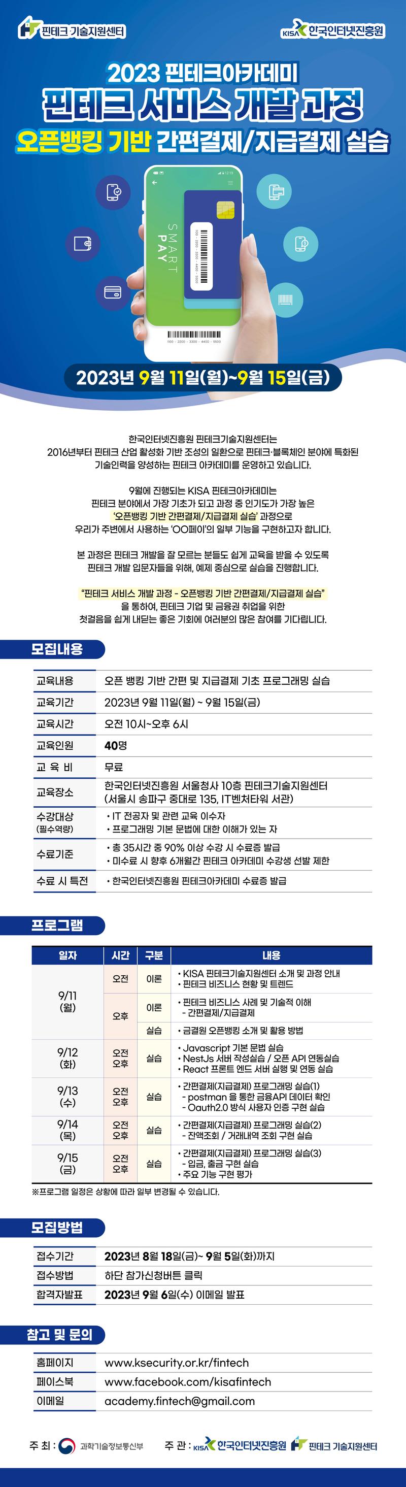 - 교육기간 : 2023년 9월 11일(월) \~ 9월 15일(금) / 5일 과정 - 교육시간 : 오전 10시 \~ 오후 6시 - 교육인원 : 40명 - 교육비용 : 무료 - 교육장소 : [오프라인 진행] 핀테크기술지원센터(서울시 송파구 가락동 78 IT벤처타워 서관 10층) - 교육신청: https://forms.gle/GkwDQiFfKiujzjsi6