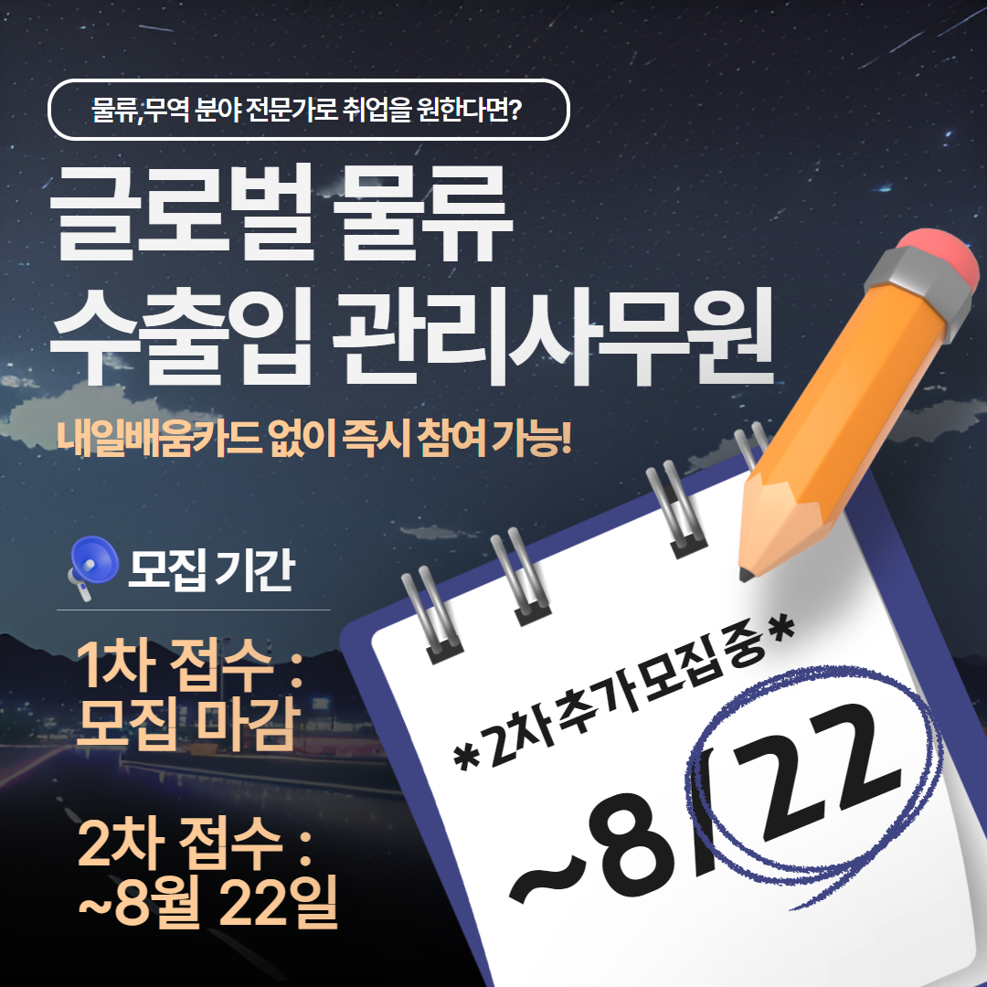 💎올해 마지막 추가모집!!!! 자격증 준비까지 한번에 가능한 훈련과정💯 💡[글로벌 물류 수출입관리사무원 추가 모집안내]💡 ❣️ 교육일정 : 8월 21일 \~ 11월 21일 평일반 (09:00\~ 17:30) ❣️ 모집일정: \~ 8월 22일 까지!! (인기과정 추가모집🔥) ❣️ 교육시간 : 평일, 09:00\~17:30(8교시) ❣️ 교육장소 : 양정인력개발센터 ( 부산 지하철 1호선 양정역 2번 출구 150m 지점 )